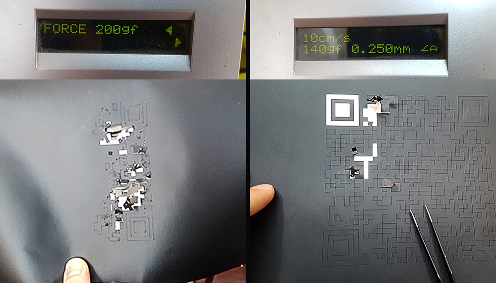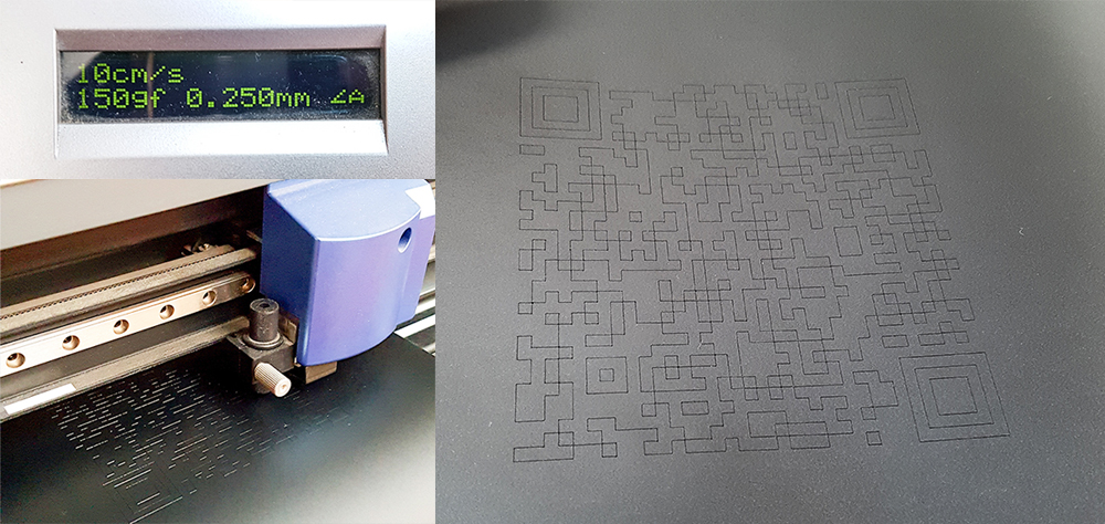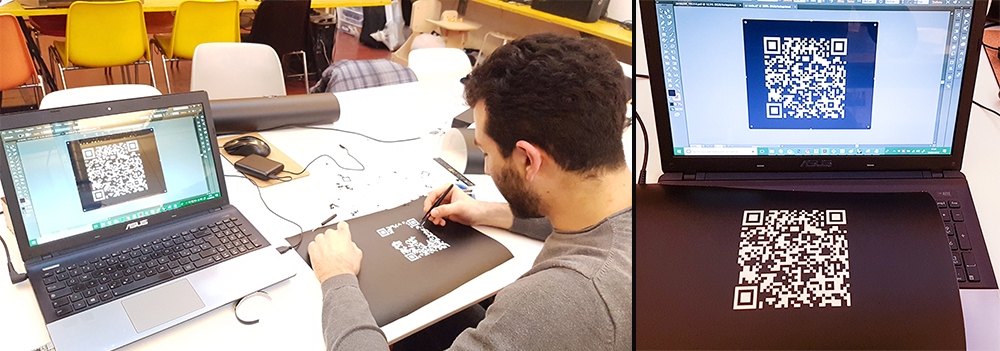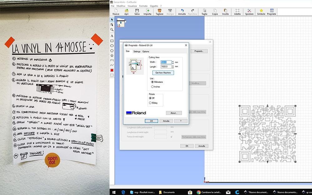 Near vinylcutter in Opendot fab lab, there is a manual for use the vinylcutter in 14 steps on the wall, written by tutors. The machine is a Roland Camm-1 Servo. I've follwed the instruction list, so I moved on pc connected to vinylcutter and opened the Qr code eps file in Inkscape, and from here I've exported directly in vinylcutter software: "Cutstudio". I've put the black vinyl roll in the machine and I've clicked on "Get width from machine" to set automatically the cutting area width.