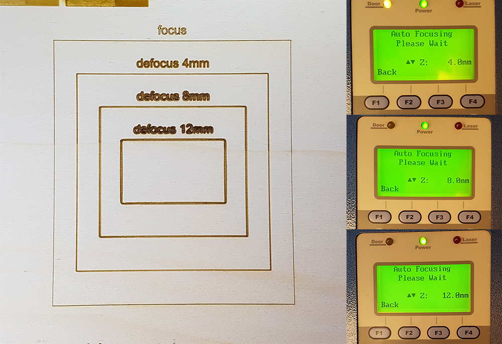 The Opendot's lasercut is a Spirit GLS. With my group provided to characterize the machine with a series of tests. After experienced with engraving and interference on playwood 4mm, as you can see on Laura Cipriani's page, we provided to test the machine on popler 3mm material, the one I chose for my press-fit kit. We can see that engraving is a technique very time expensive, that can be avoided in some specific but frequent case, using some trick. For my project I want to create a pattern decoration made by lines, so I can work in vector settings that are faster than raster ones. During the lecture on computer-controlled cutting by Neil Gershenfeld, was explained that in a lasercut, a laser ray is focused by lens in a specific point, where create a cutting with 0.2mm of width, more or less. But what happen if I defocused voluntarely? In this case the line is not more 0.2mm, but its width increases so as increases the defocus. So we prepared a test with 3 different steps of defocus, from one to other we move down the bed of lasercut for 4mm, to evaluate when the borders of lines becames unacceptable. When the laser is perfectly fosued (the machine have Autofocus), the width of line is 0.2mm. When we moved down the result was absolutly acceptable, the line's width is now 0.6mm. At 8mm was again perfectly acceptable, the lines have a good uniformity of width, that is now 1mm, just in corners there is a little smooth. At 12mm the line was again clean, the width is now 1,4mm but the smooth on corners was more evident, is perfect again for curviline drawing. This trick is very useful when we need to create solid texts or words and don't want spend so much time in engrave the solid hatch of letters o numbers (we have alwais remember that in this case we have use vectorline and font in single stroke fonts and we have disable raster)