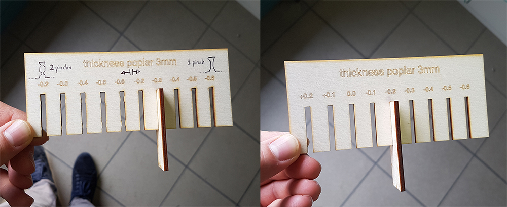 In the second test, we have provided to design two tests to verify the kerf and the interference for joint. This is suited for popler with 3mm thickness. The setting for this test are Speed 4% - Power 100% - 500 ppi for cutting, and Speed 70% - Power 100% - 500 ppi for engraving. The tests demonstrate that we have the best result in kerf, reducing of 0,2mm the ideal dimension of joint in cad drawings (0,1 for each side). The best interference to have a solid joint between two pieces in propler 3mm, is one pinch at the middle of join's side, with 0,15mm of width.
