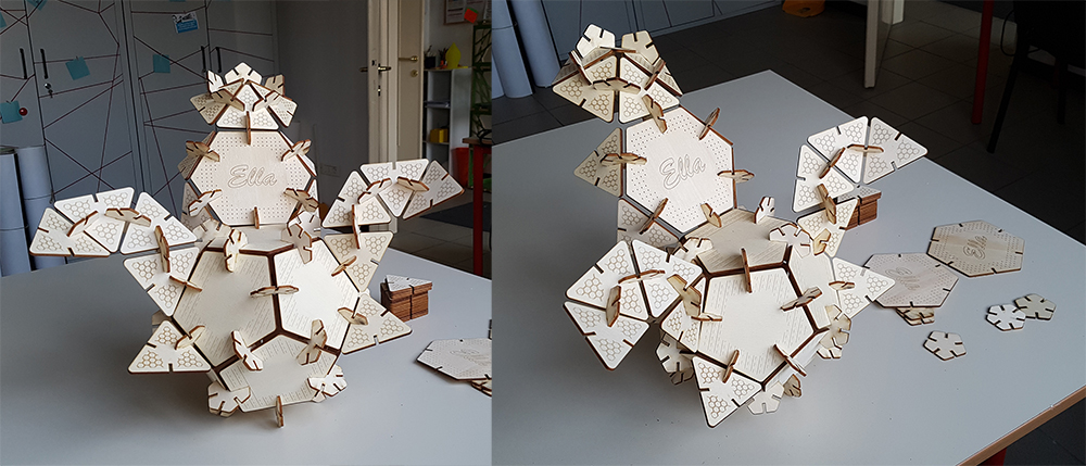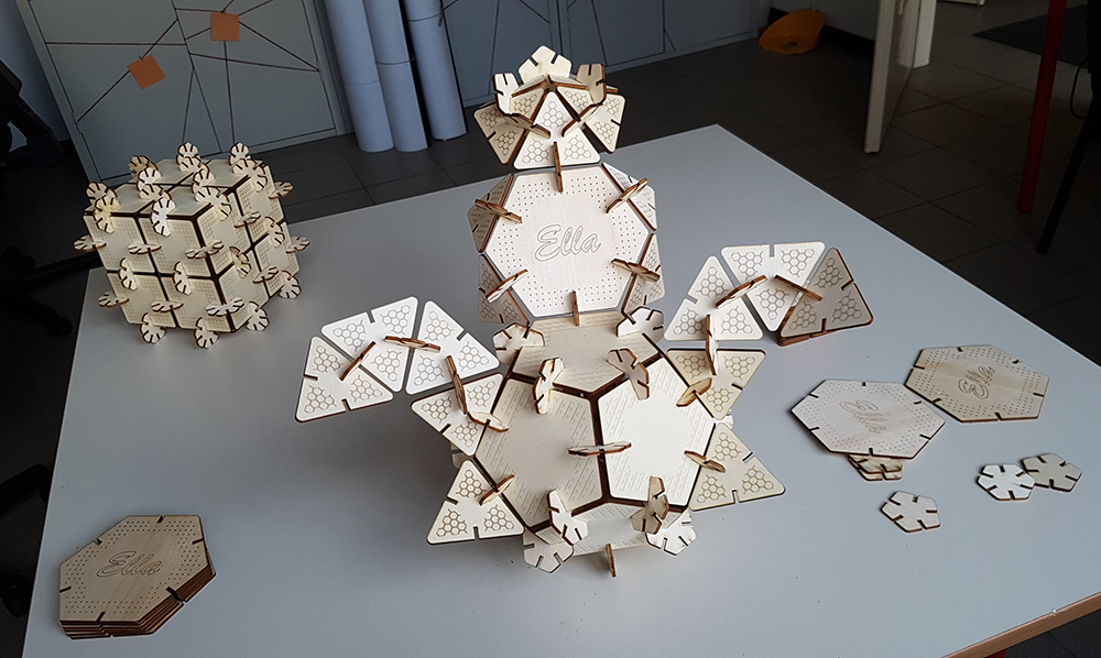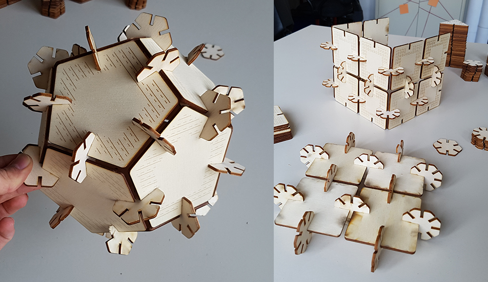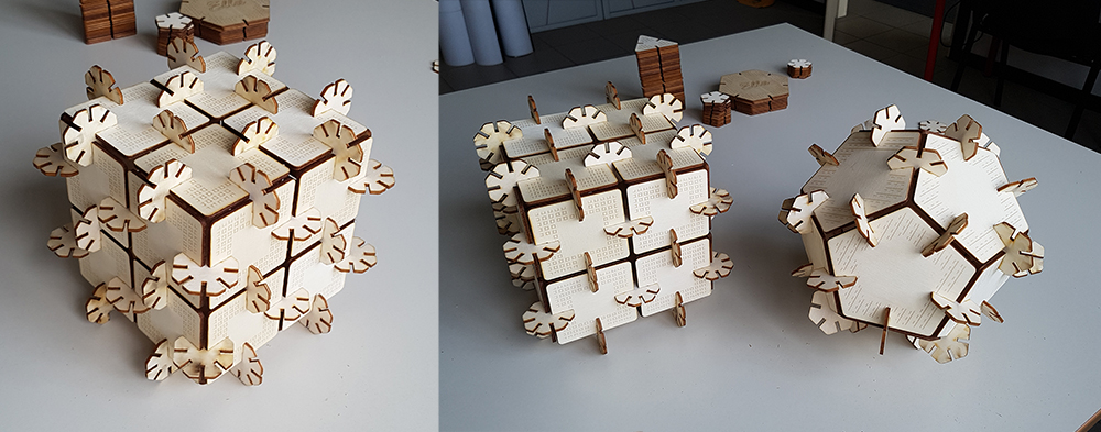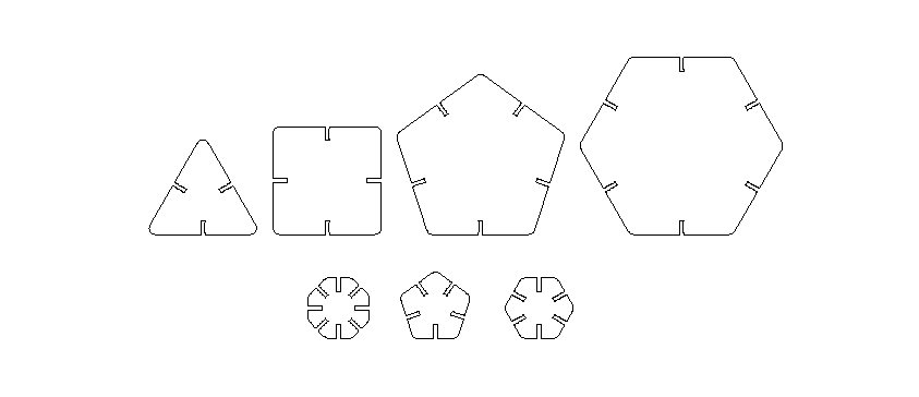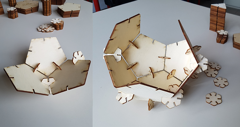 Finally I can play with my press-fit kit. The geometries I've chosen allow to create infinity possible combinations and forms. I can combinate in regular solid, as cube or dodecahedron, or more complex shapes. Having the same side for each polygon was a seccessful trick, because in the assembling, the transition from one polygon to another, between two neighboring sides, is continuous, because the sides are equal, and the shapes that can be created are perfectly consistent even when using different polygons.