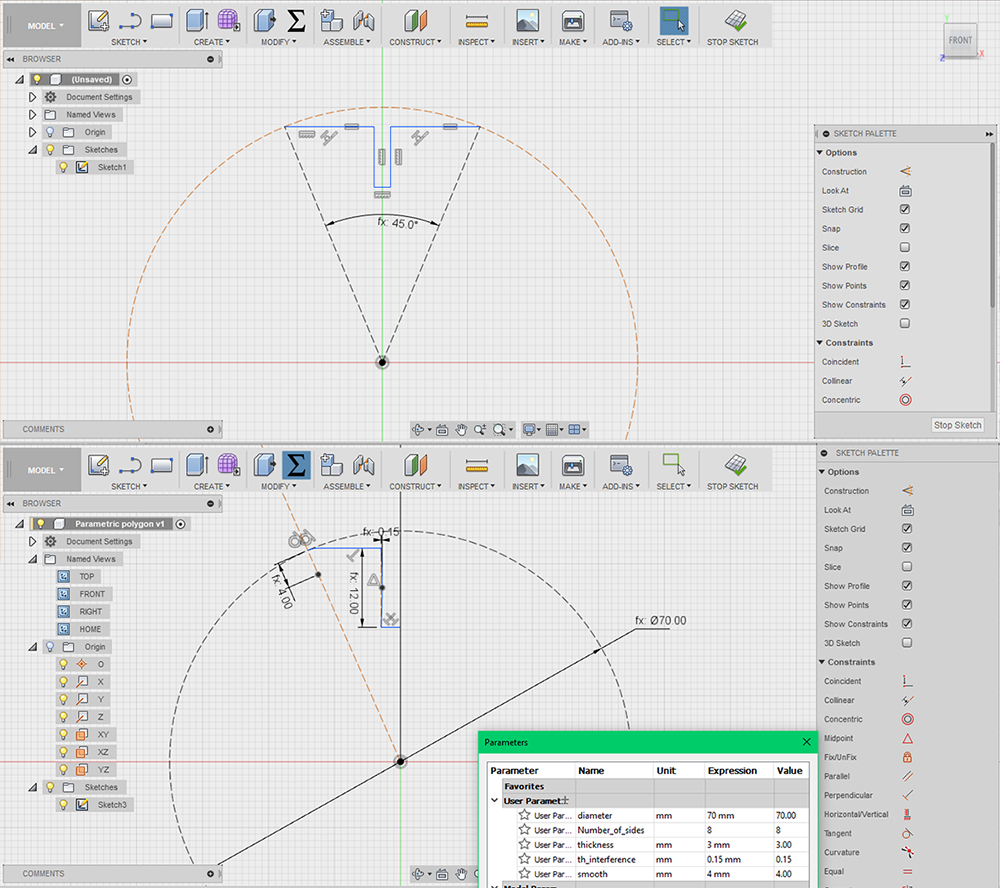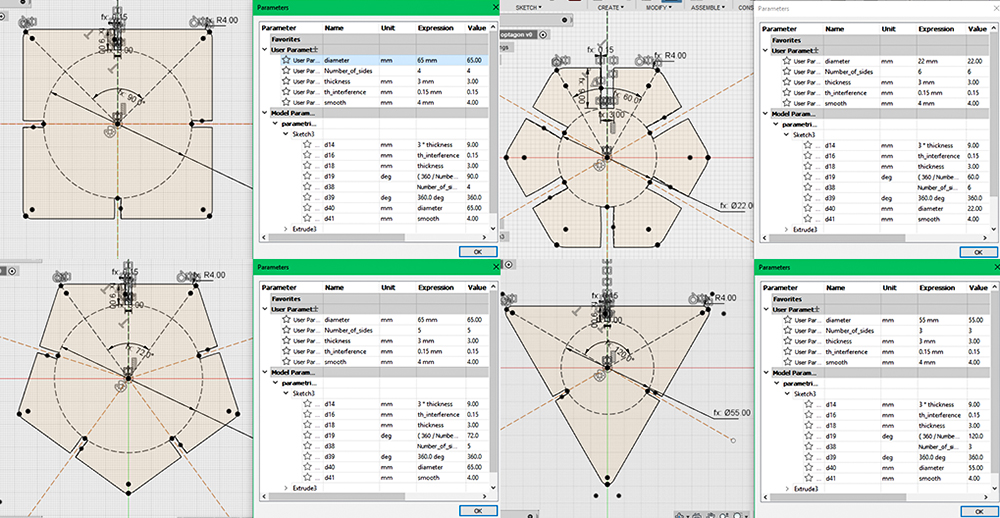 My press-fit project concern in a series of regular polygons, with a join on each side, that can be assembled each other in a million of possile solution. Fantasy is the only limit. In this case, modeling in parametric software is an amazing solution, because I could parametrize every characteristic of my polygons and change the shape just changing the parameters, without remodeling the enteire object any time. One of this parameter could be the number of sides, so was sufficient to model one polygon and obtaining all others just changing 2 parameters: the scale of polygon (changing the diameter of the inscript circumference) and the number of sides. I've worked in Fusion 360 by Autodesk that is a parametric software, free if you are a student, educator or hobbist. For the project I'll use popler sheet, the same that I've tested during group assignment on the characterization of lasercutter. I started designing the join, that must be the same for every polygon. I've designed it giving a numeric parameter to the width: 3mm, the same of popler sheet's thickness. I've given an unit-less parameter to the height of join, it must always be 4 times the thickness. I've given an interference of 0,15mm, that i found be good during characterization of lasercut. I've given a smooth to the two ends of lines, with a radius of 4mm, fixed for all polygons. I've costrained all the sketch to an angle, and dimensioned with the equation: 360°/Number of sides, so that changing the number of sides, the sketch recreate a regular polygon with the exact number of sides I want. After that i've circumscraibed the sketch starting from the origin of polygon, constraining it to the vertex of sketch. In this way I simply can change the size of polygon changing the diameter of circumference that is another parameter.