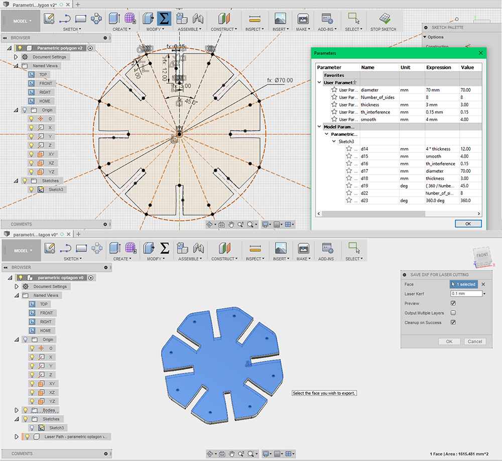 I've applied a circular pattern to my sketch, having as center the origin of circumference. Now is possible to me changing the number and the size polygon, just changing diameter of circumference and number of sides. I started with 8 sides for an optagon. In the end I've extruded the sketch putting as distance the parameter "thickness" (3mm, the deep of popler sheet). To export in DXF, the format file supported by lasercuts, I've installed in Fusion an incredible plug-in: DXF for Laser. This automatically calculates the offset in according to kerf value found in the tests of characterization, 0.1mm was the best value.