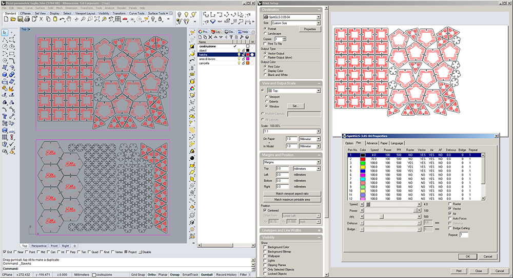 I've opened the DXF files in Rhinoceros 3D, drew some decoration using hatchs, and made a nesting on an area 700cm x 500cm, the dimensions of popler sheets. I've chosed to design triangles, squares pentagons and hexagons, that have same side. Then I've designed smaller octagons, pentagons and hexagons that are my joint elements, so I can assembly and play with a large series of angles: 45°, 60°, 72° and their multiples. I've put drawings to engrave on a red layer and cut ones on a black. For cut I put 4% of speed and 100% of power, while 70% of speed and 100% of power for engraving. My decoration consists in texture lines, so I can work faster as vector, avoiding raster.