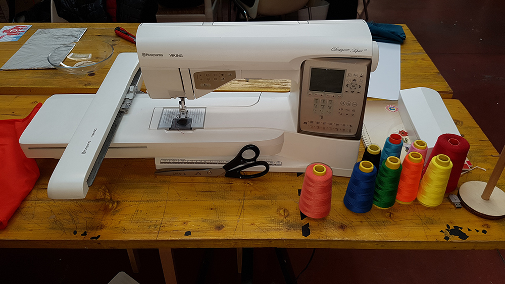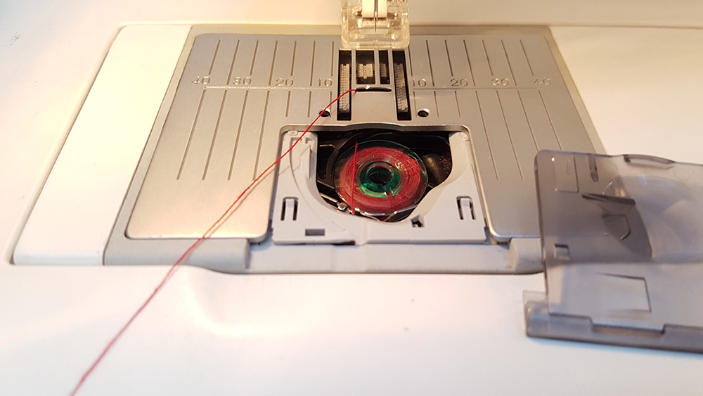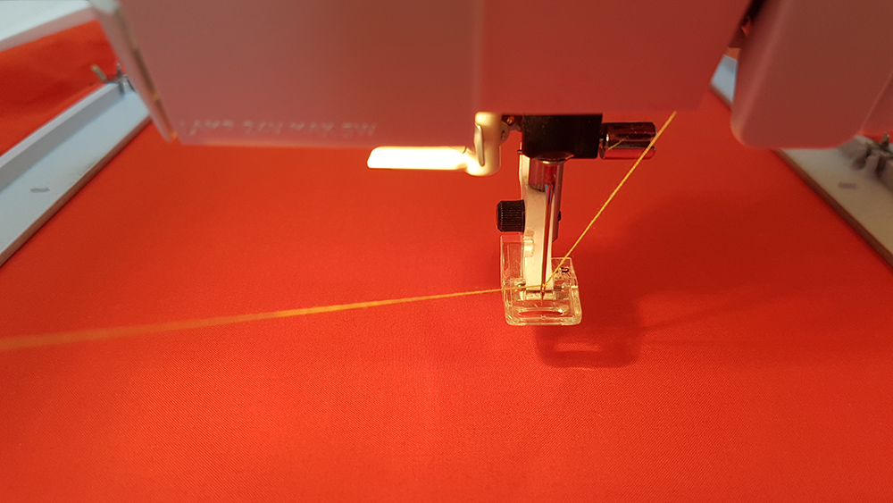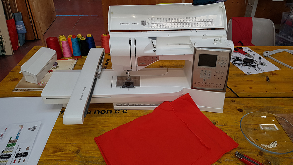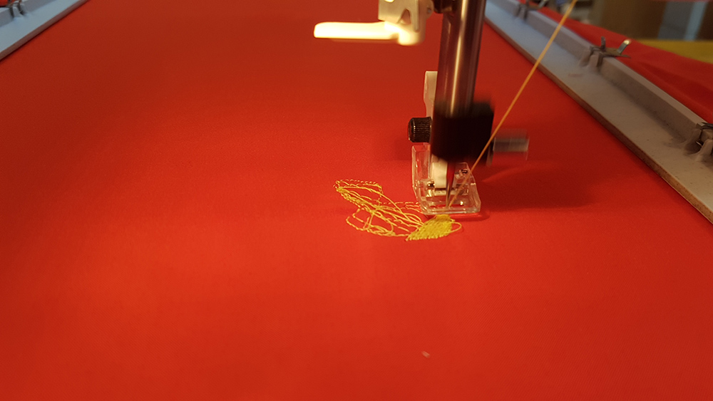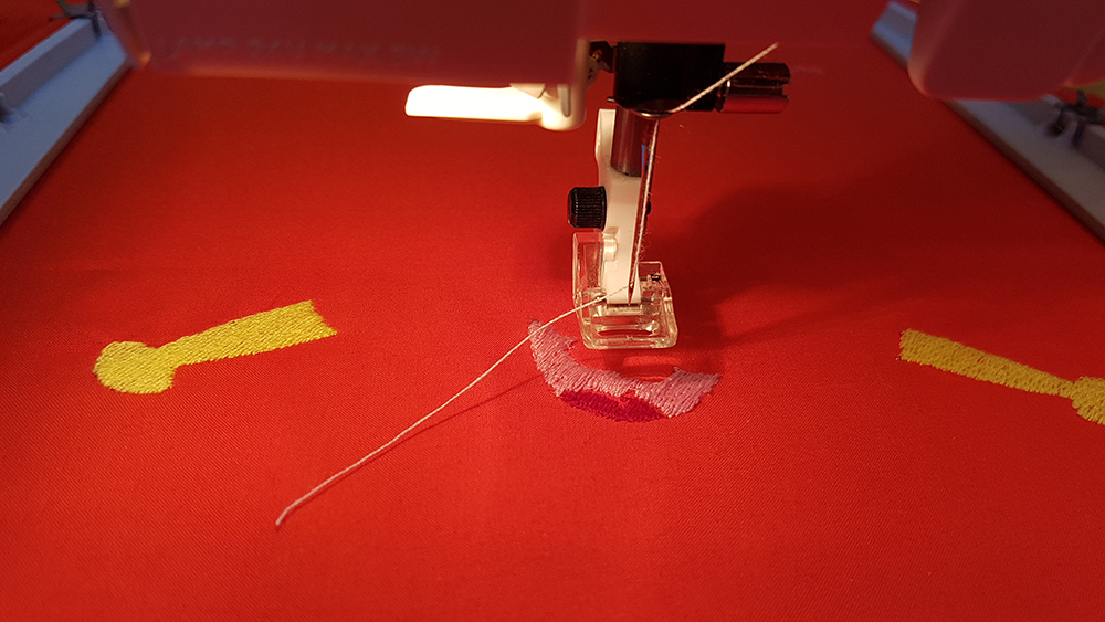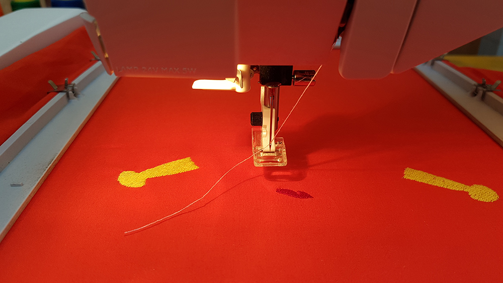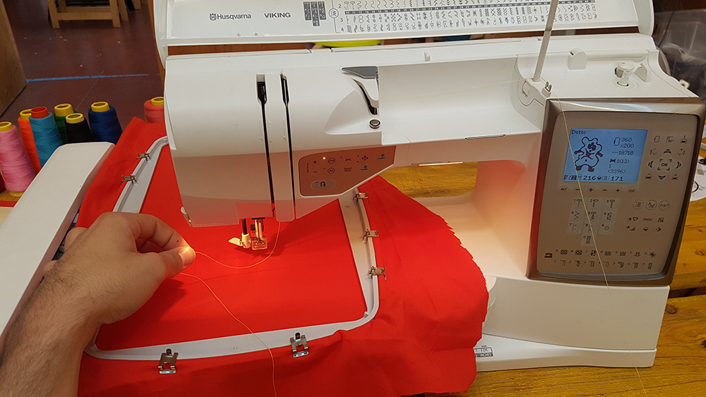 To create the embroidery you need a fabric and two thread. First thread is for the visible embroidery, on the front of fabric, for this reason is called Front Yarn, the second thread is Shuttle Yarn, and this ties the front yarn to the fabric that remain betwen two yarns. For shuttle yarn you can use a random color because it's hidden by fabric and front yarn. I chose a red thread and I've put it in the bottom location on the machine.