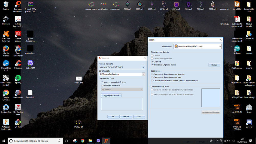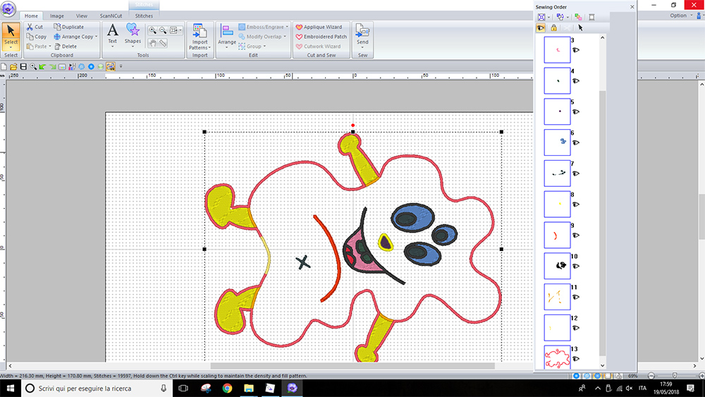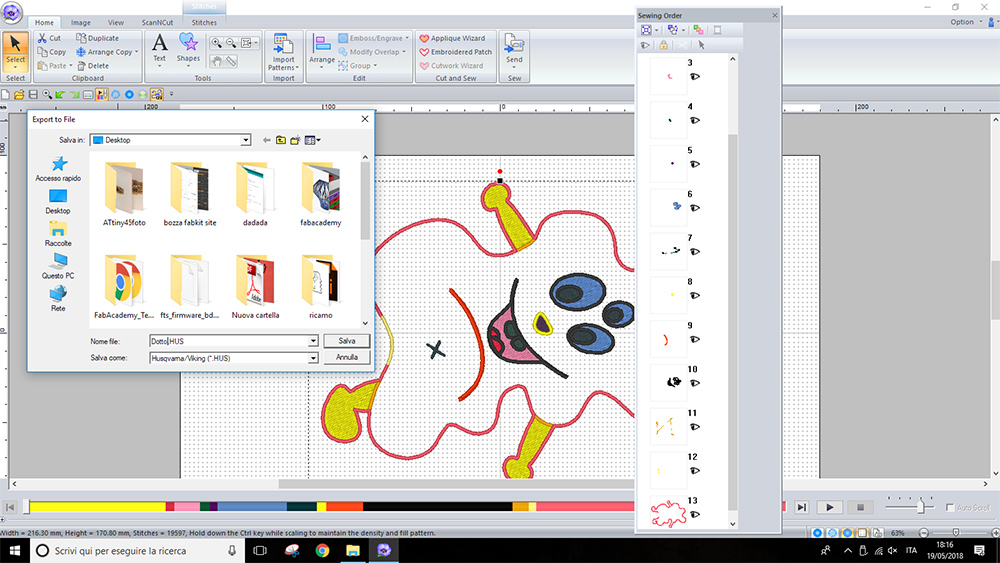 At this point I could go to "Layout & Editing" menu of the software, in which i could select the frame of machine, scale and position the figure and assign the "Sewing Order". Finally I've exported the .HUS file. This file need to be converted to a .vp3 file. I made this conversion with Premier Plus. So I saved this .vp3 file on a usb stick and move to machine