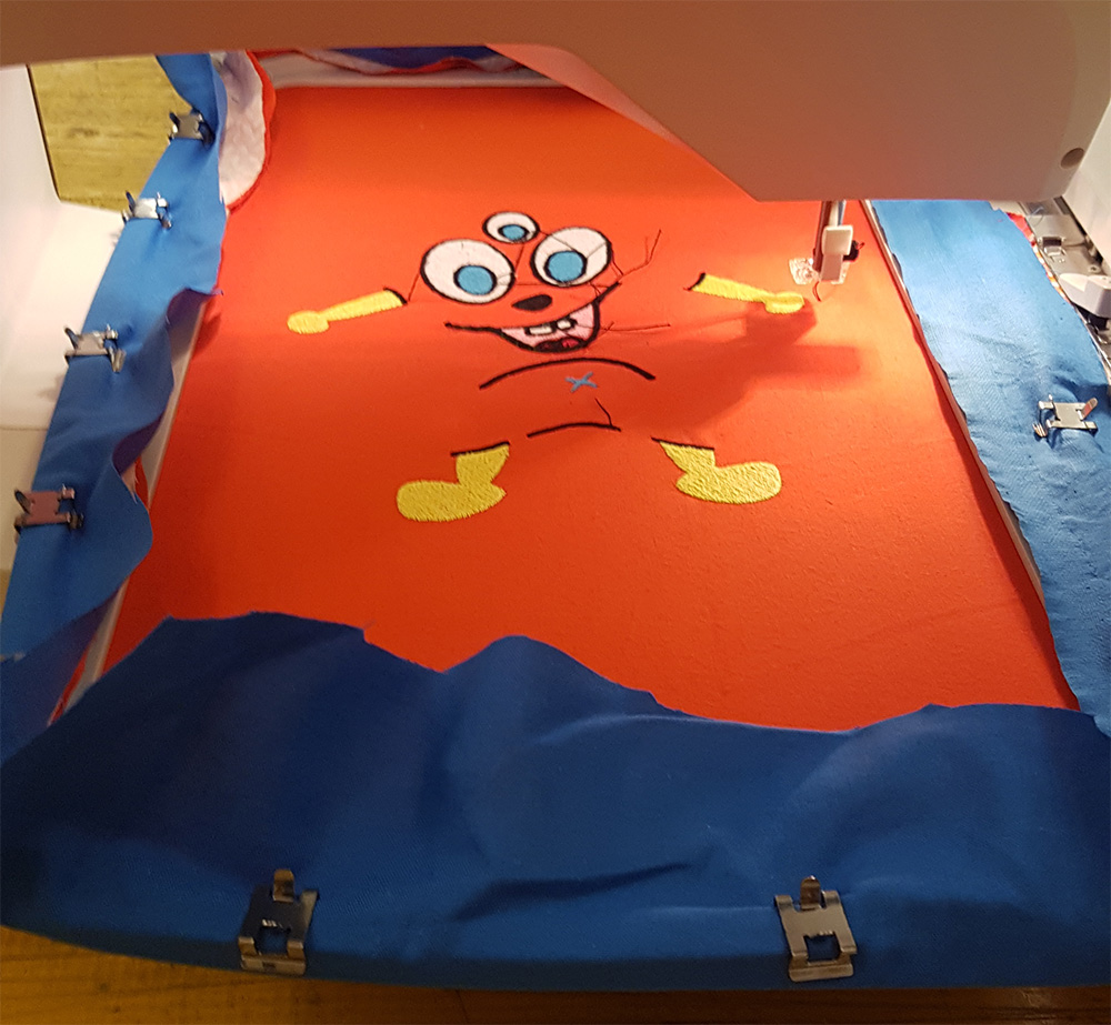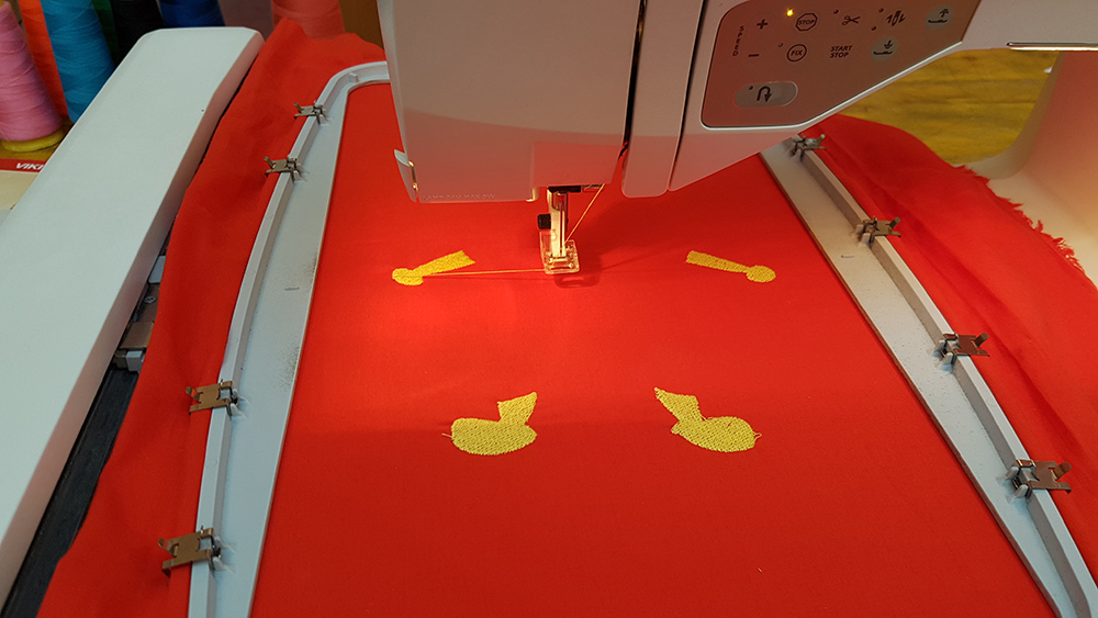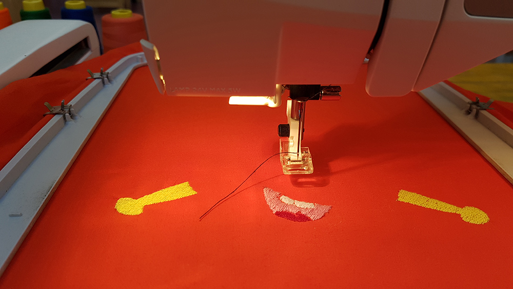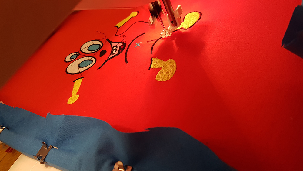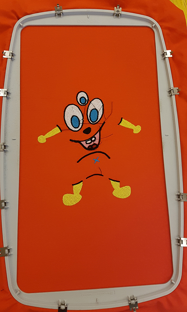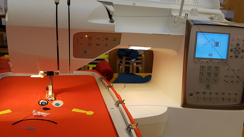 Then I uploaded the file on machine, mounted the frame to the arm of machine and put first thread. In my sewing order, legs and arms of puppet is the first step, so I've mounted a yellow thread and started the embroidery.