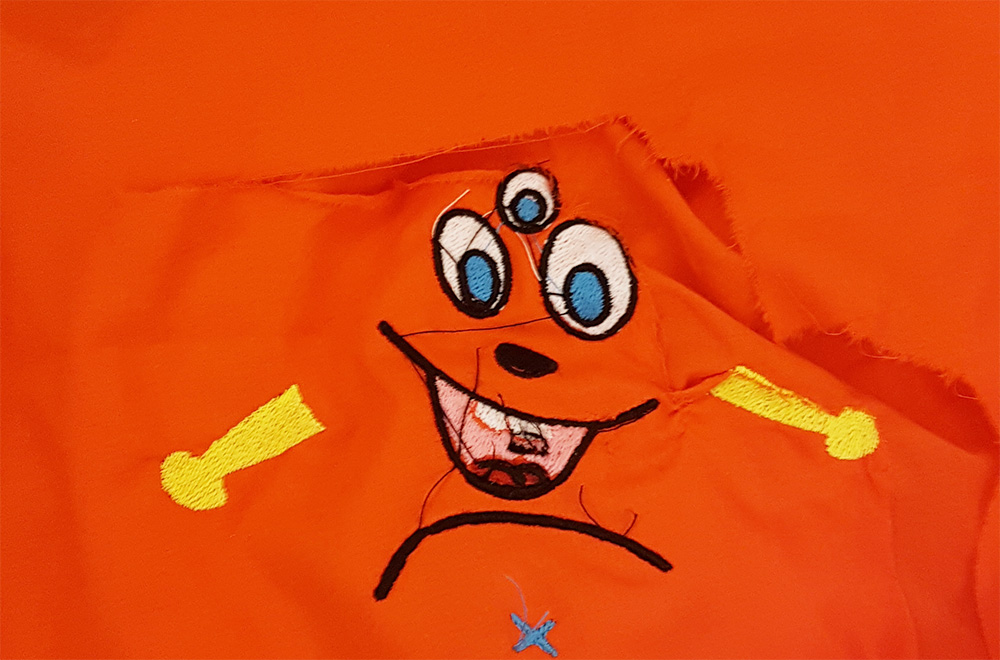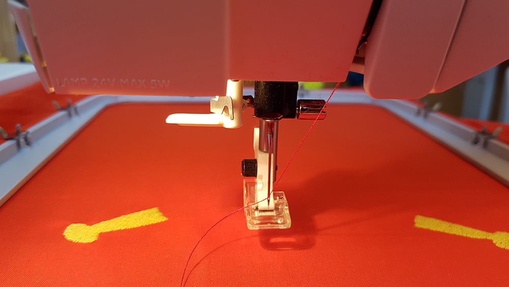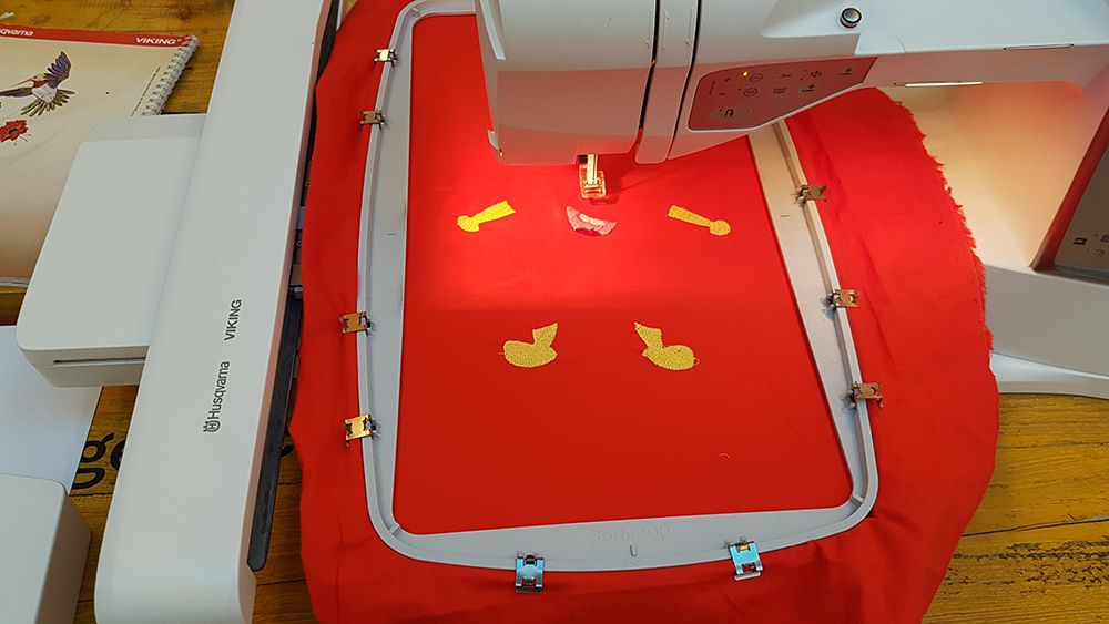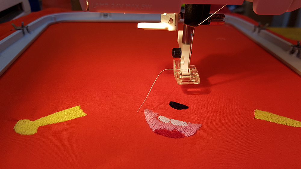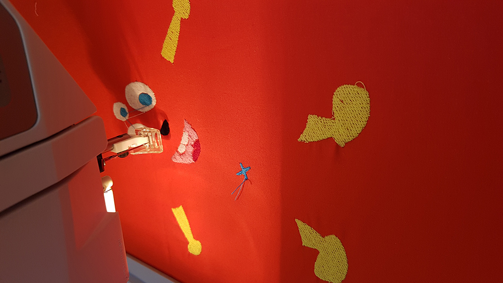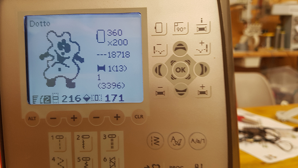 Then I uploaded the file on machine, mounted the frame to the arm of machine and put first thread. In my sewing order, legs and arms of puppet is the first step, so I've mounted a yellow thread and started the embroidery.