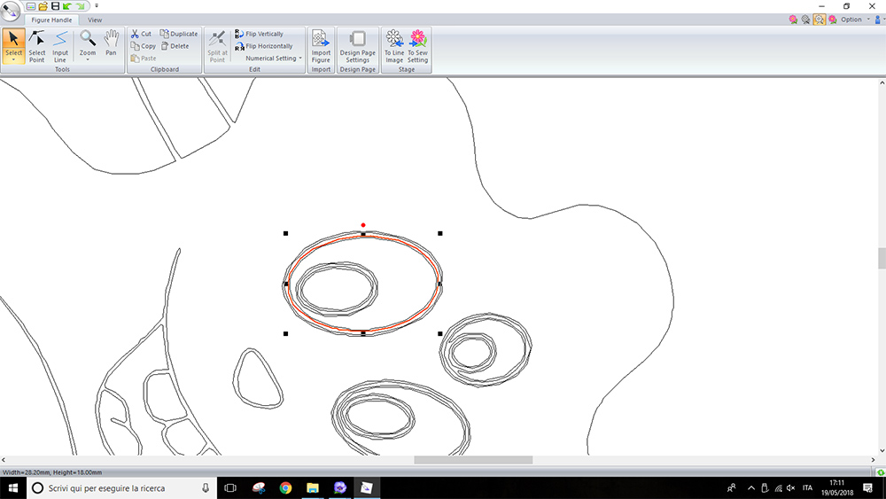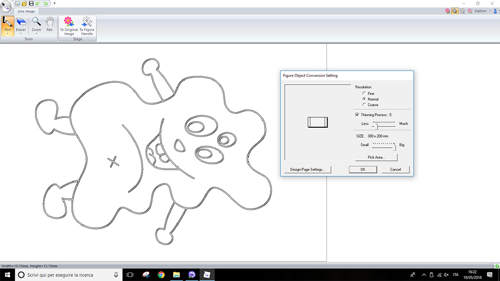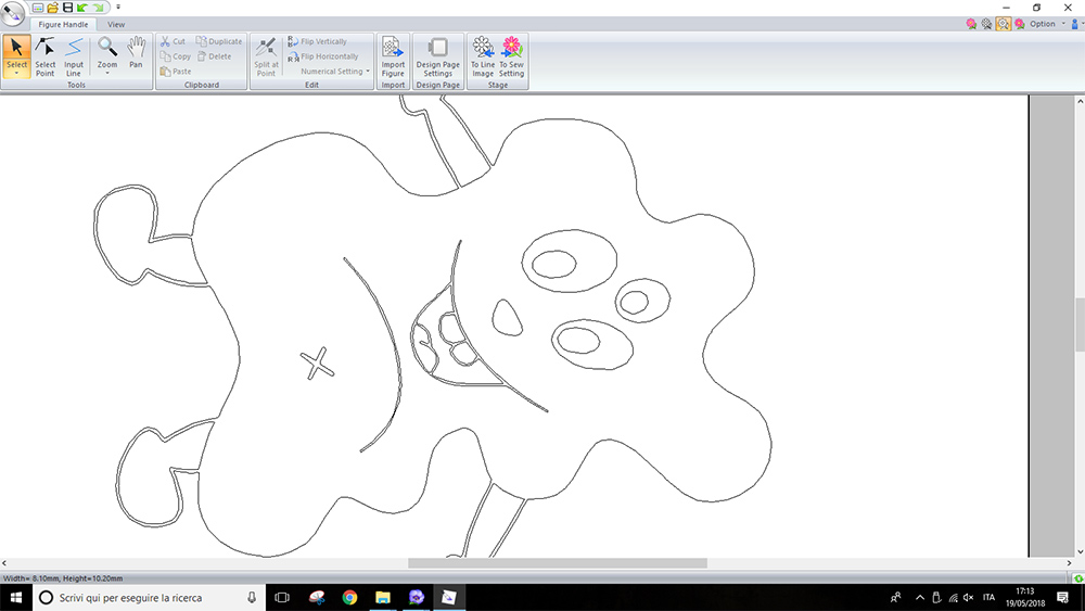 I opened the .png drawing in PE-DESIGN 10, in the "Design Centre" section, under "Line Image" menu. I converted the .png drawing in vector lines that the software can recognize and use for machine paths, by clicking on "To figure handle" button.