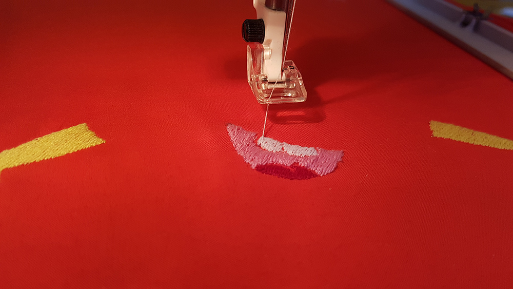 When first layer ended, I mounted the second thread, the red one, to make the tongue of puppet and then the pink one to make the mouth.