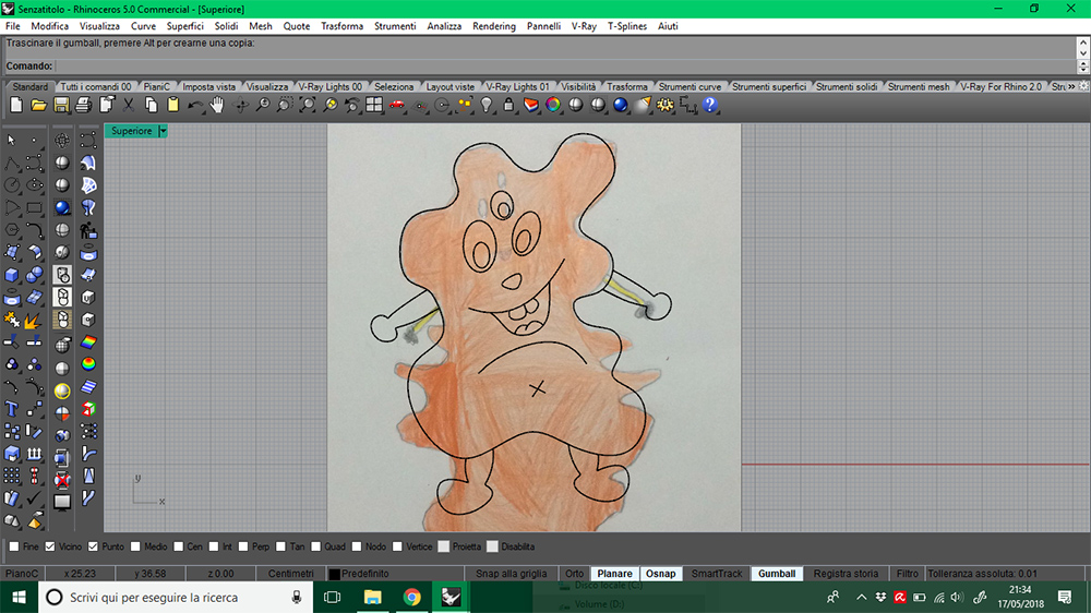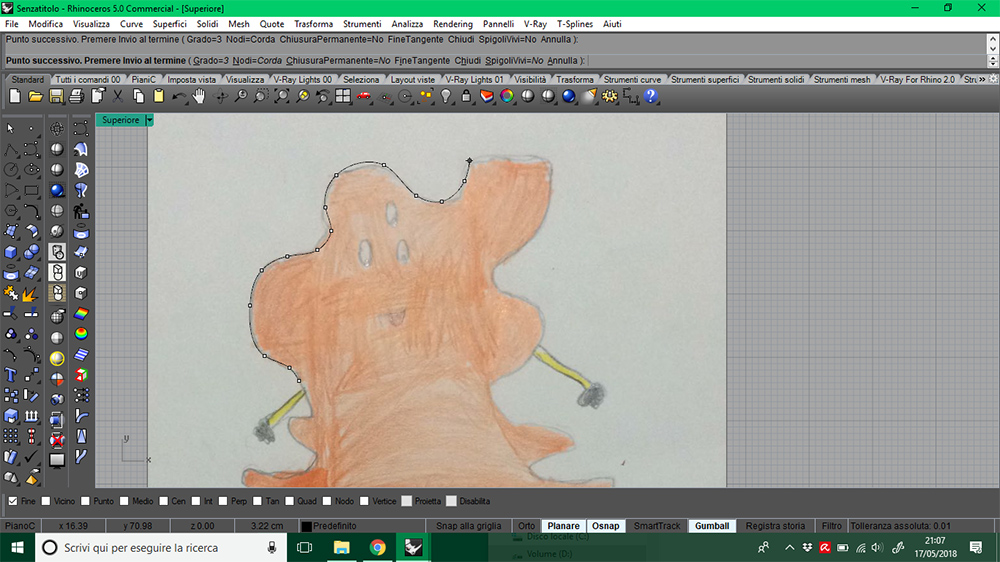 In Rhinoceros3D I re-draw and adjusted my niece's sketch with interpolated curve, to make it makeable with machine. I exported it in .png picture