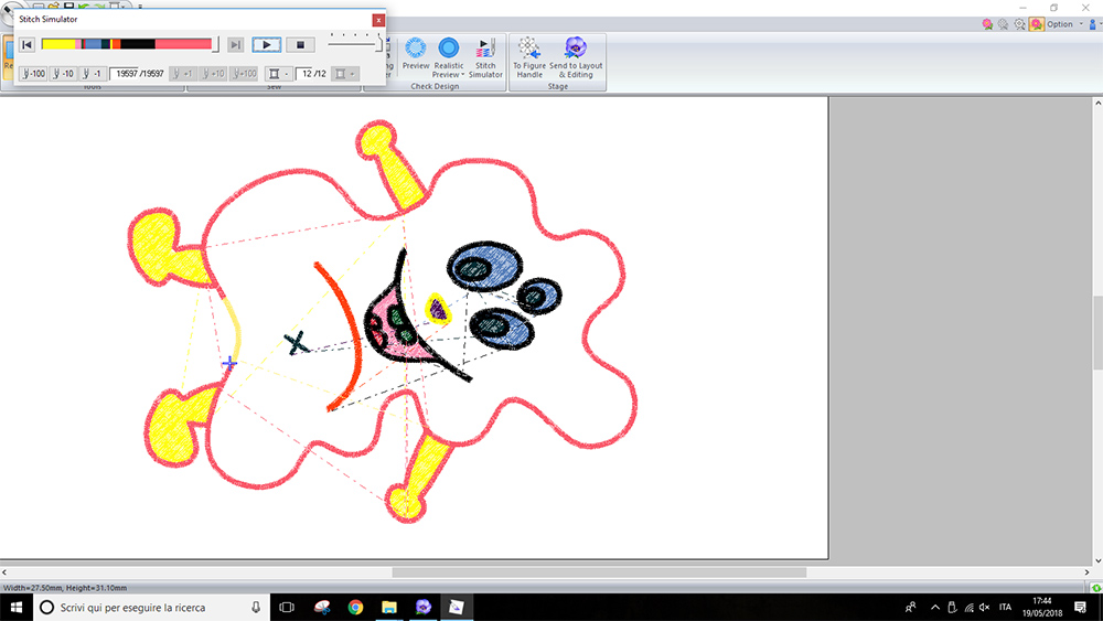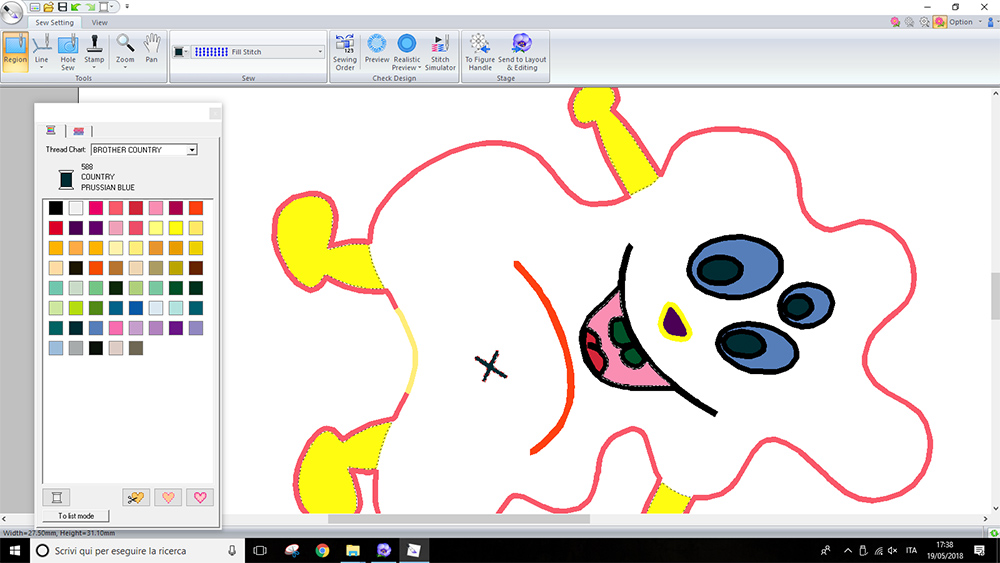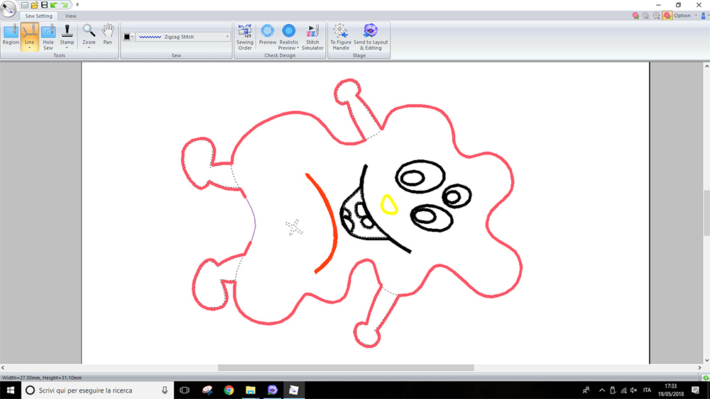 Then, under "Sew setting" I assigned different stitch kind to borders and region to infill. For "Line" I used a "Zigzag stitch", while for "Region" I used "Fill Stitch". Is not important assign the right color to the thread, because on machine you can always change the color, but is important change the color to visualize the different part in the different steps. I divided the bord at base because I want the machine stop the sewing on that line. In that region i left a piece of fabric, I've sewed it by hand, after stuffing the puppet. I could also see a simulation of machining by clicking on "Stitch simulator"