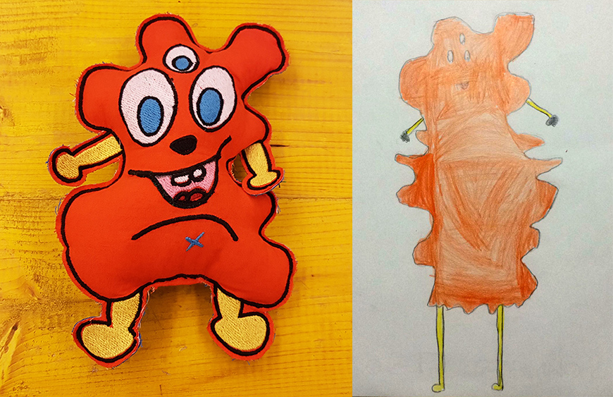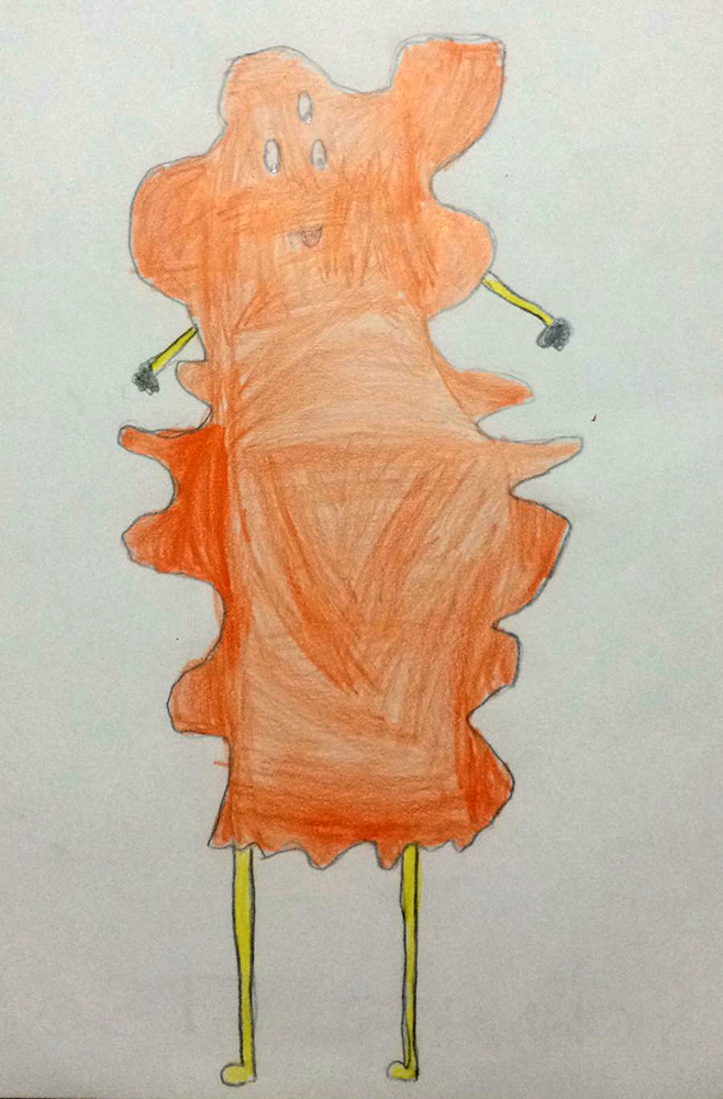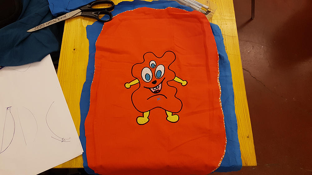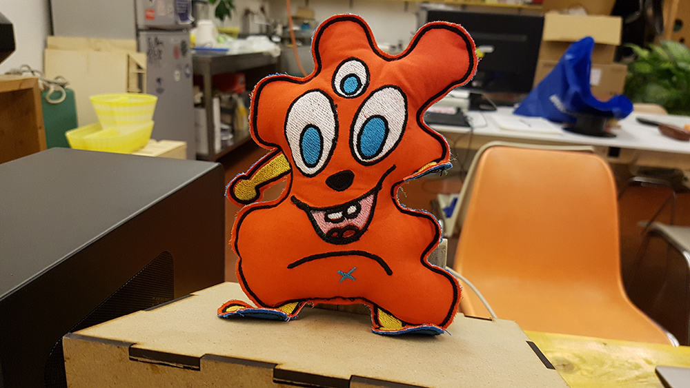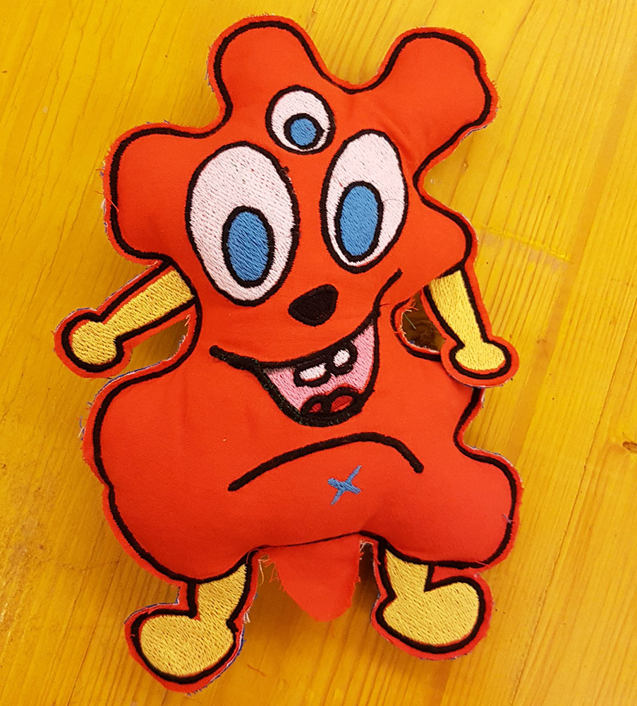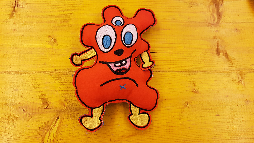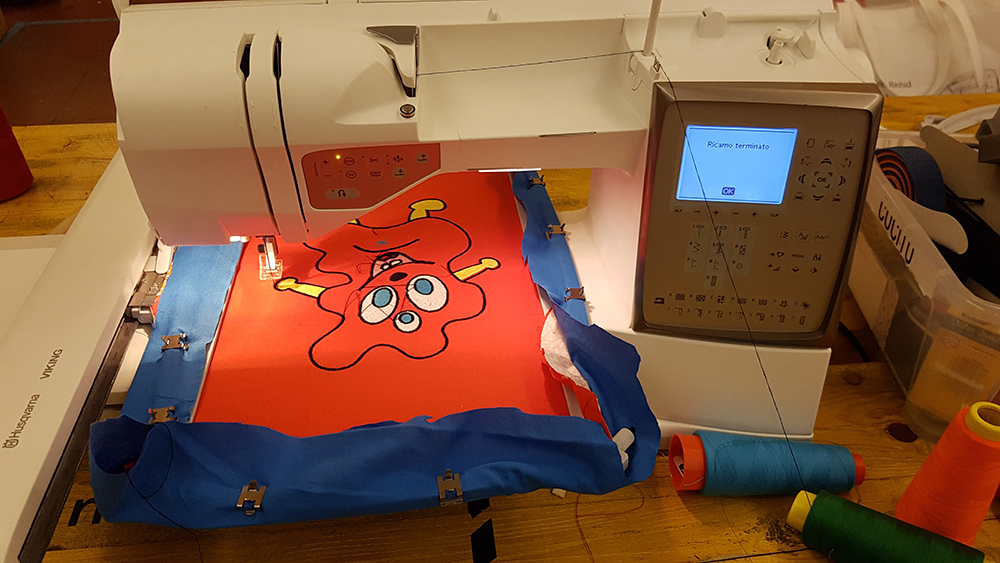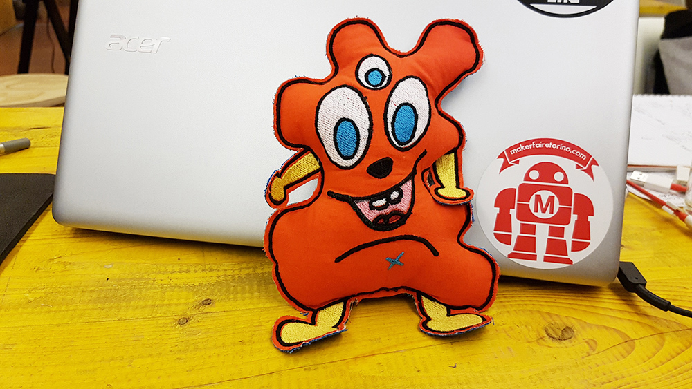 In this week, at Opendot we chose to work on Embroidery CNC. My classmate, Laura Cipriani, is one of the author of Bottega dei Dotti. Dotti are little puppets, created with Embroidery CNC machine, following the sketces of children that in this way can create their personal puppets with shapes and colors they want. Laura made us a lecture on embroidery CNC technology, and showed us how use the machine to create the puppuet. The machine is a Designer Topaz 30. So I asked my niece to send me a drawing of a nice monster she would like as puppet friend. She sent me the following drawing: