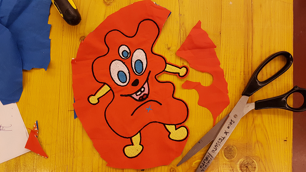 When sewing ended, I dismounted the fabrics from frame and started to cut the emroidered part from the excess of fabrics, paying attention to leave a piece of fabrics where I have to sewing by hand the puppet.