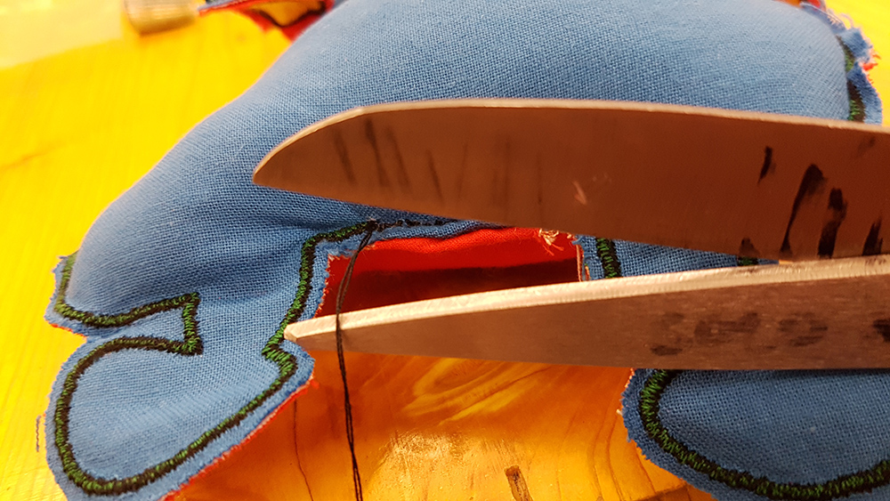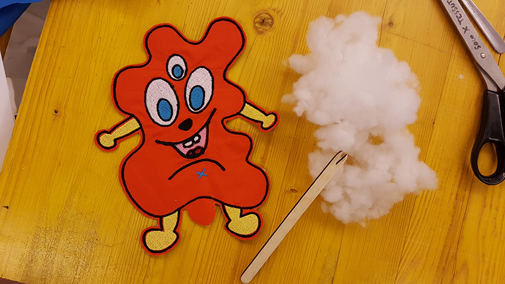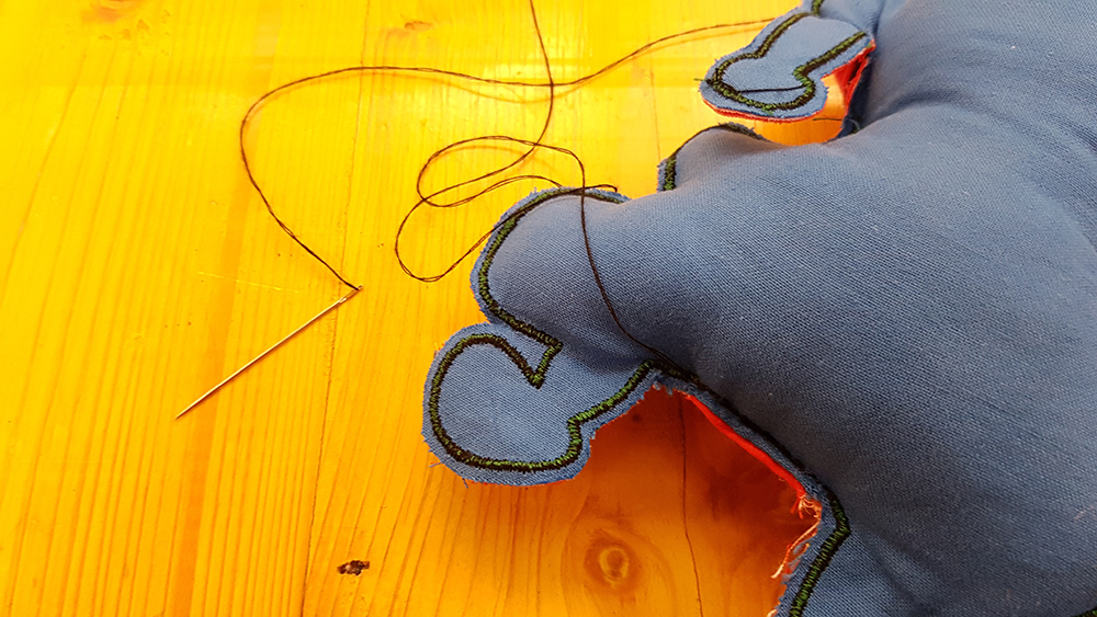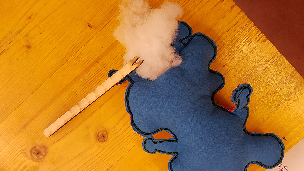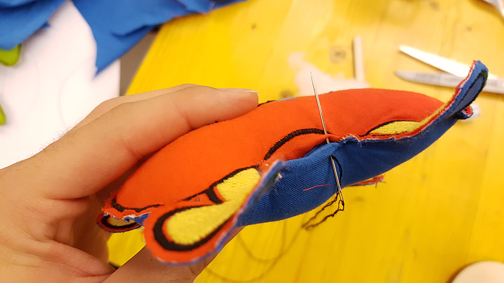 Last step of puppet fabrication was to sewing by hand the puppet closing the hole of stuffing infill.