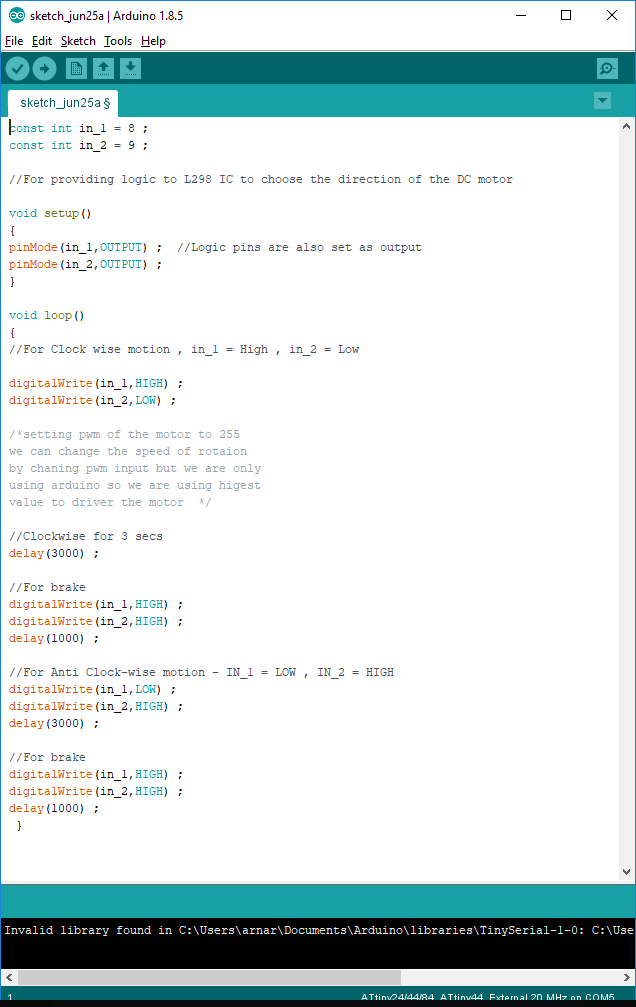 We assumed that we could've made the accelerometer work, hence the board is designed for a ATtiny 44. The next step was to make the board and it has one 6 pin for programming, three 4 pin, one for the accelerometer, another for the power and the last one for the motor. I used a 12v dc adapter to power everything and 5v regulator in the board.