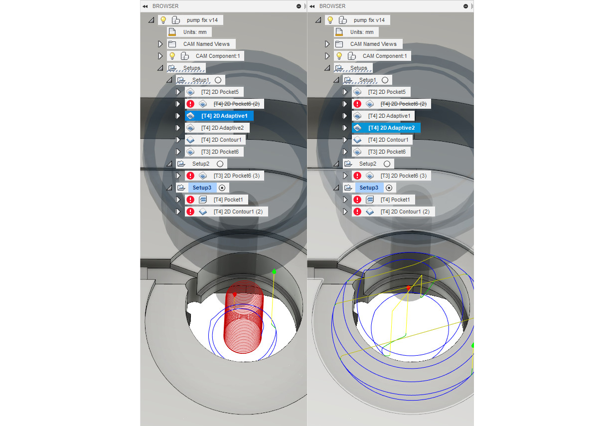 The error was more than likely to cause damage to either tool, machiene or project. It kept rendering inefficient milling, mixing the order of cutting out the hole for the motor. (Smoothing toolpath before clearing out toolpath).