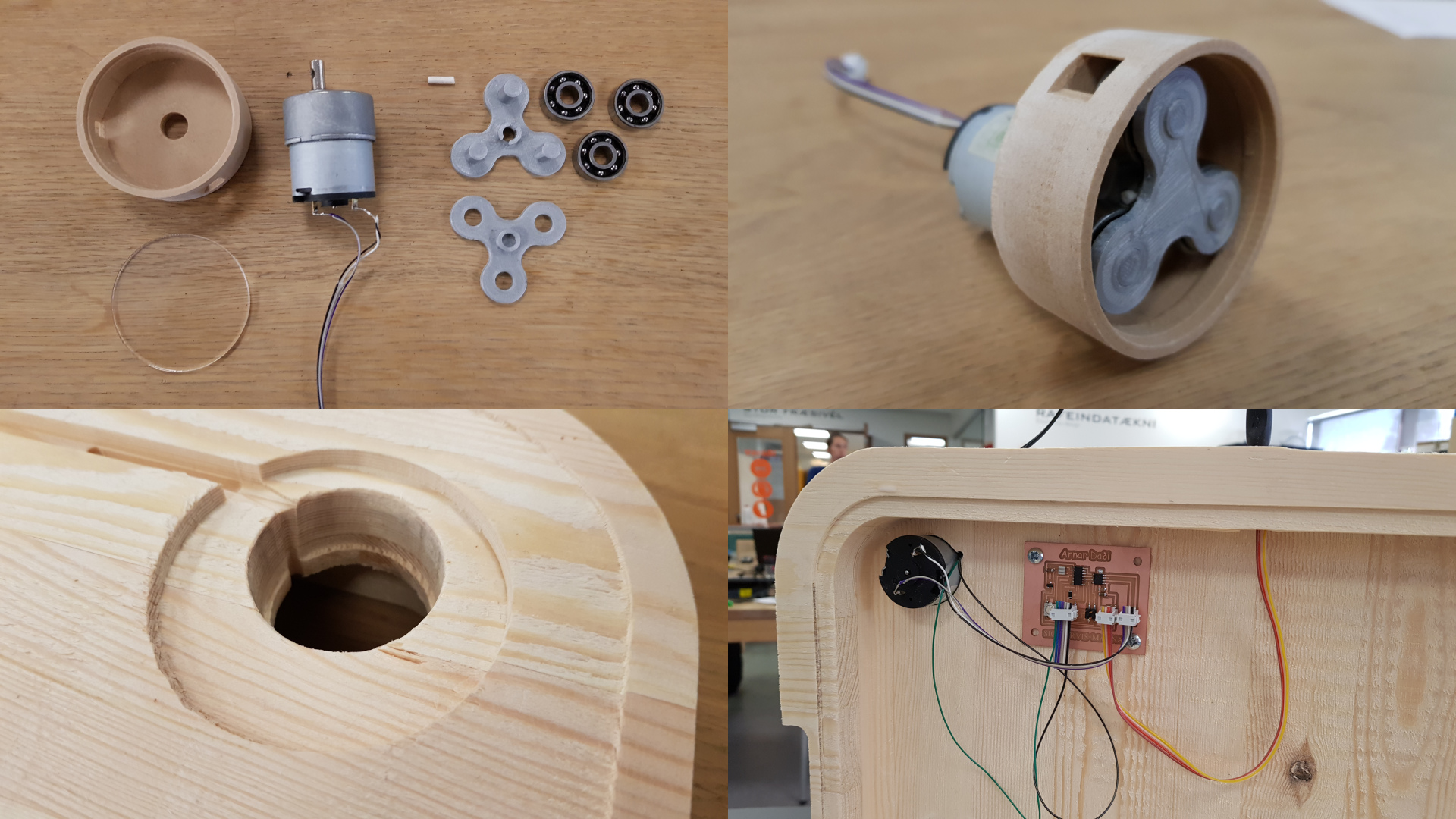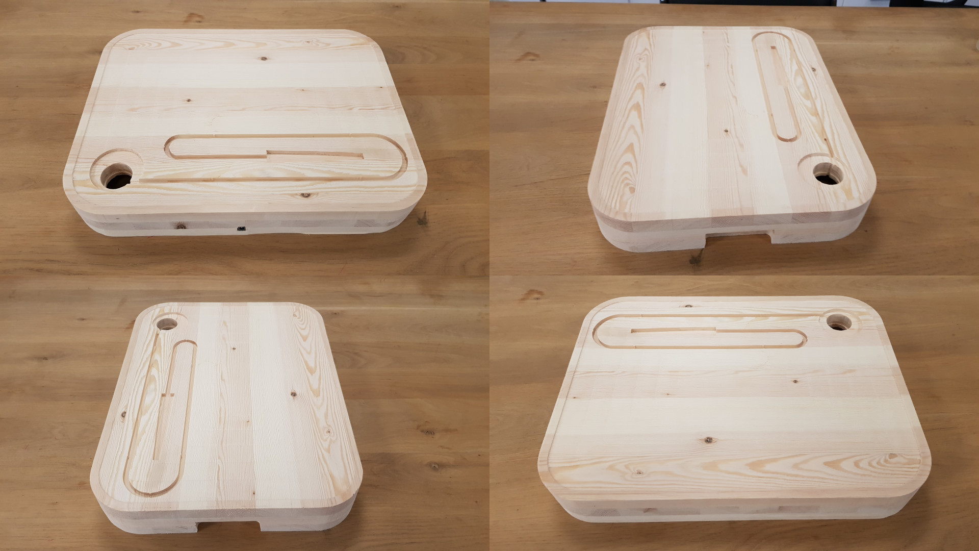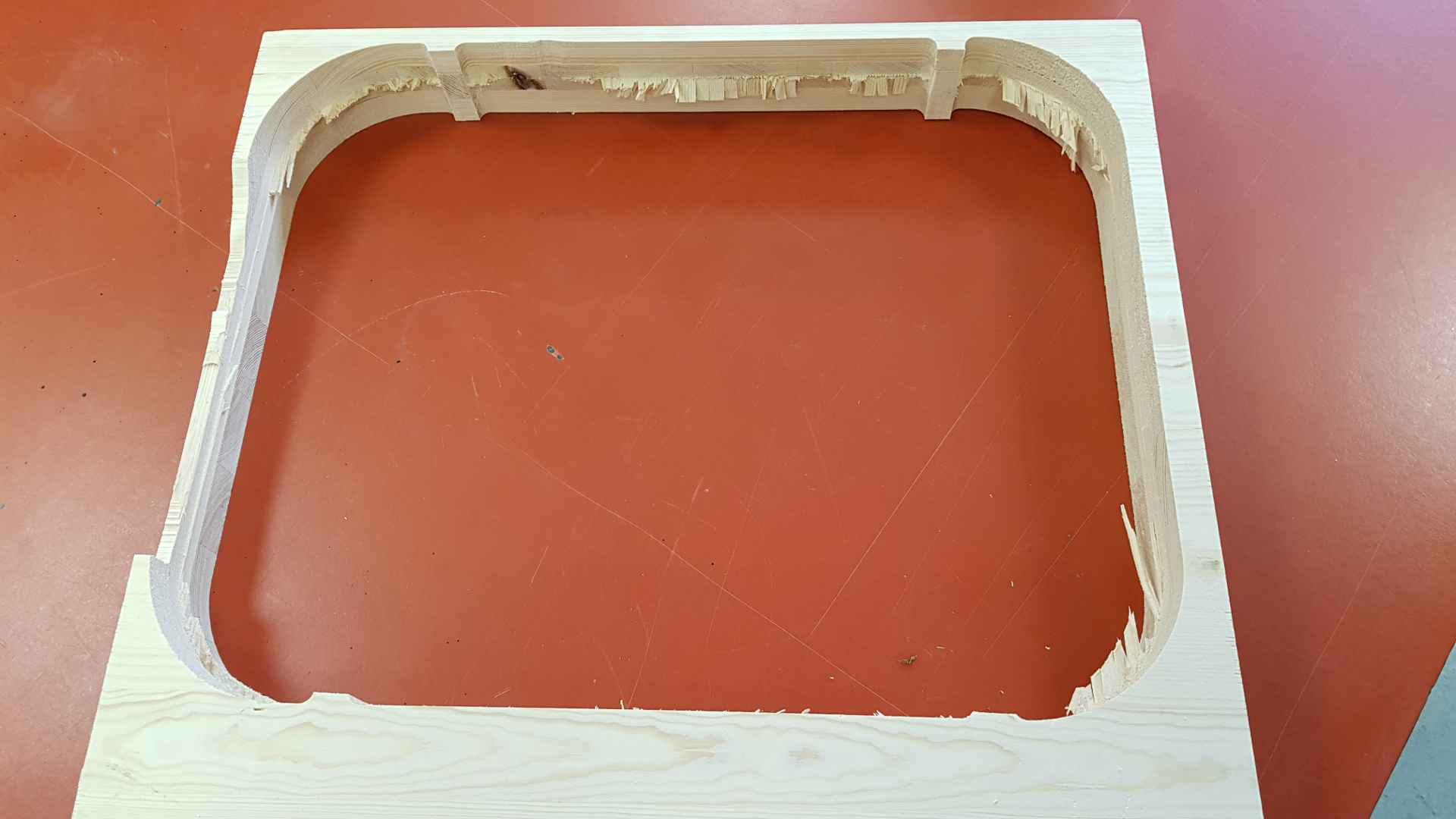 To present the prototype, hide the circutboard and place the motor in something. I decided on designing a wooden tray. I found some scrap pieces of wood in the FabLab and with the assistance of the local high school wood teacher, the scraps got plained and glued together for me, so I could start shopbotting with a nice thick block of wood.