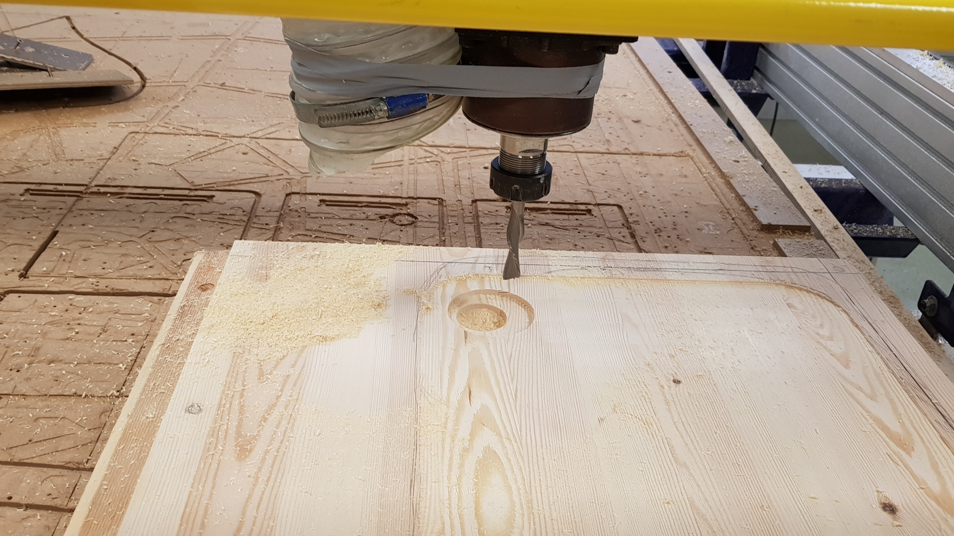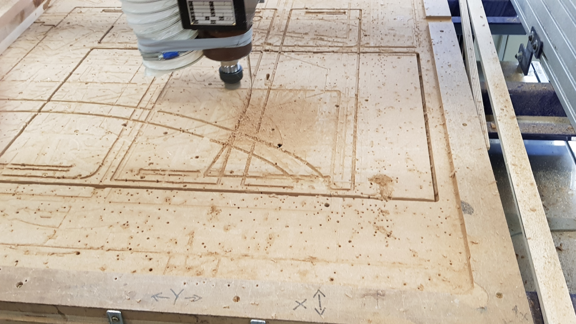 When making a double sided mill it's good to have some sort of guidance points when rotating the block. I made toolpaths for each side and for rotating the block I created holes to position it. I designed holes for dowels and mirrored them to create the holes for the sacrificial bed. Hence when rotating the block I could put in the correct spot. There was a very minor missalignment because the holes in the bed were a bit smaller and we had to drill them to fit the dowels (it was ~0.1mm).