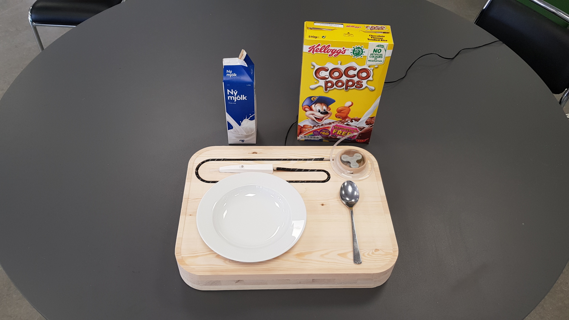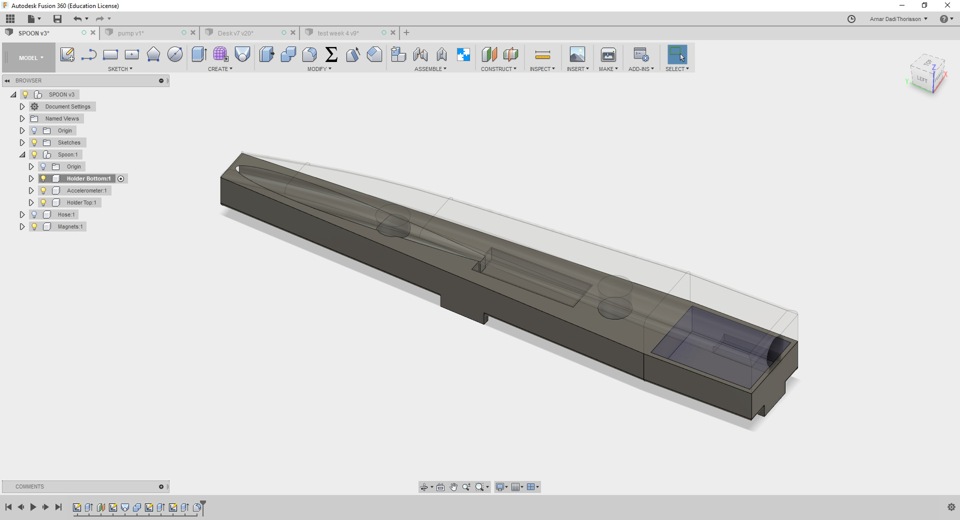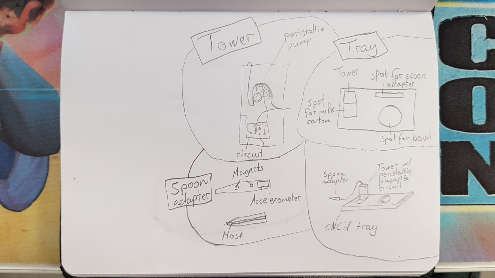 When the user is holding the spoon with the holder and makes a dipping motion, returns with the spoon flat, the pump will engage and dispense milk into the spoon. I designed it to fit nicely in the hand. To have it safe for food I added magnets so the user can use a metal spoon so it can be changed. The holder was 3d printed.