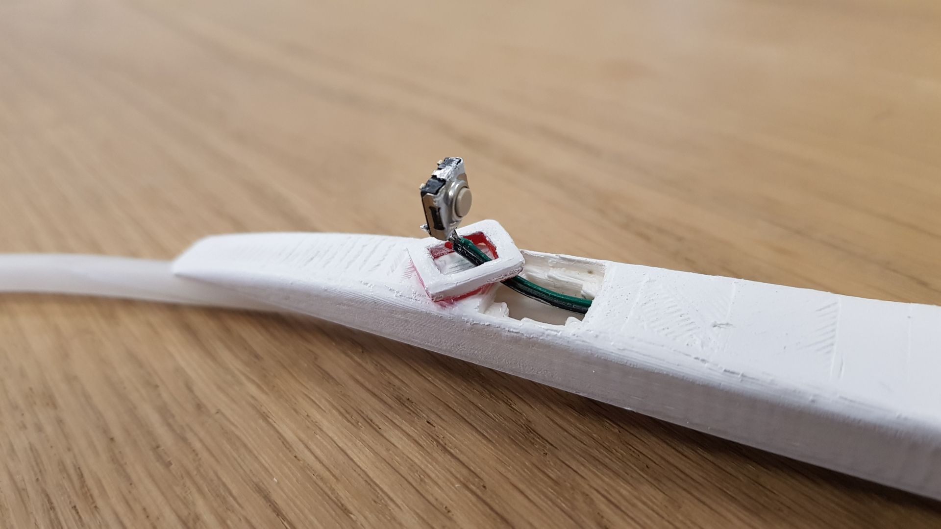 At the time, redesigning the board with a bigger chip was not an option because I was getting too close to the final presentation deadline. Instead I had to go for plan B and simplify my spoon prototype by using a button as input instead. The button is connected to the 6 pin header (miso pin on the ATtiny44).