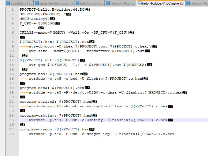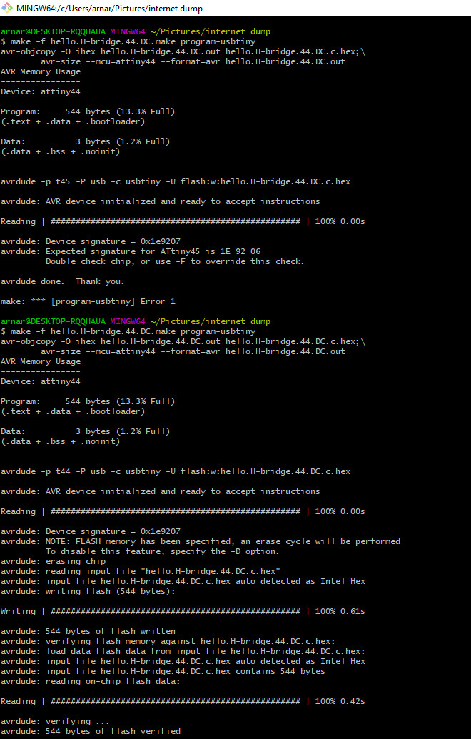 I had trouble at first with trying to program the board and got an error message "make: *** [program-usbtiny] Error 1" and I searched through the FabAcademy archive for a solution to that error. I found out that the code was using three spaces insted of 1 tab.