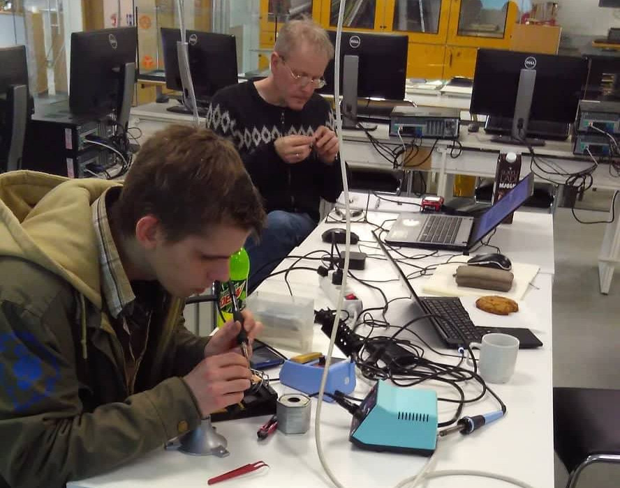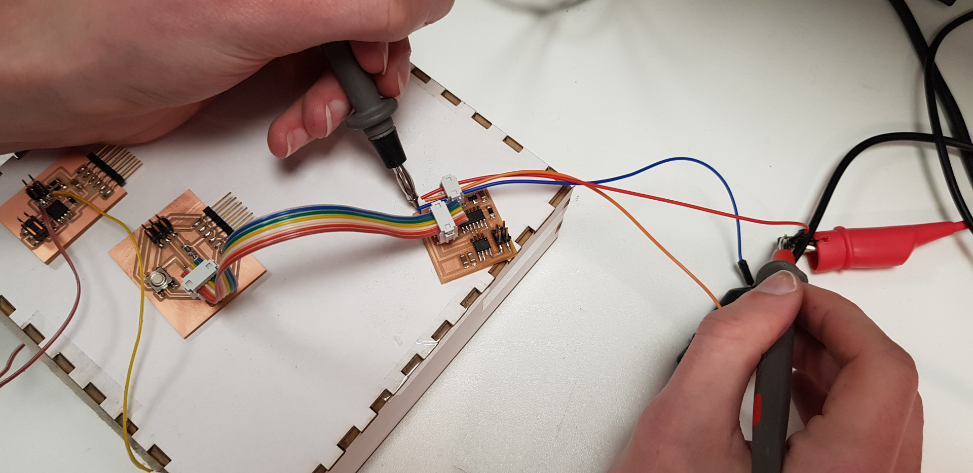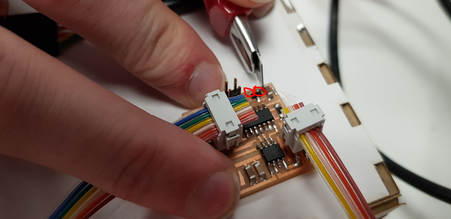 After that was fixed I tried hooking up the motor and used the power supply to run the motor. It didn't work so me and Bas looked at the board and saw that the power is going into the regulator from the wrong side. I cut off the connection as shown in the picture and I also used the multimeter to mesure the continuity of all connections.