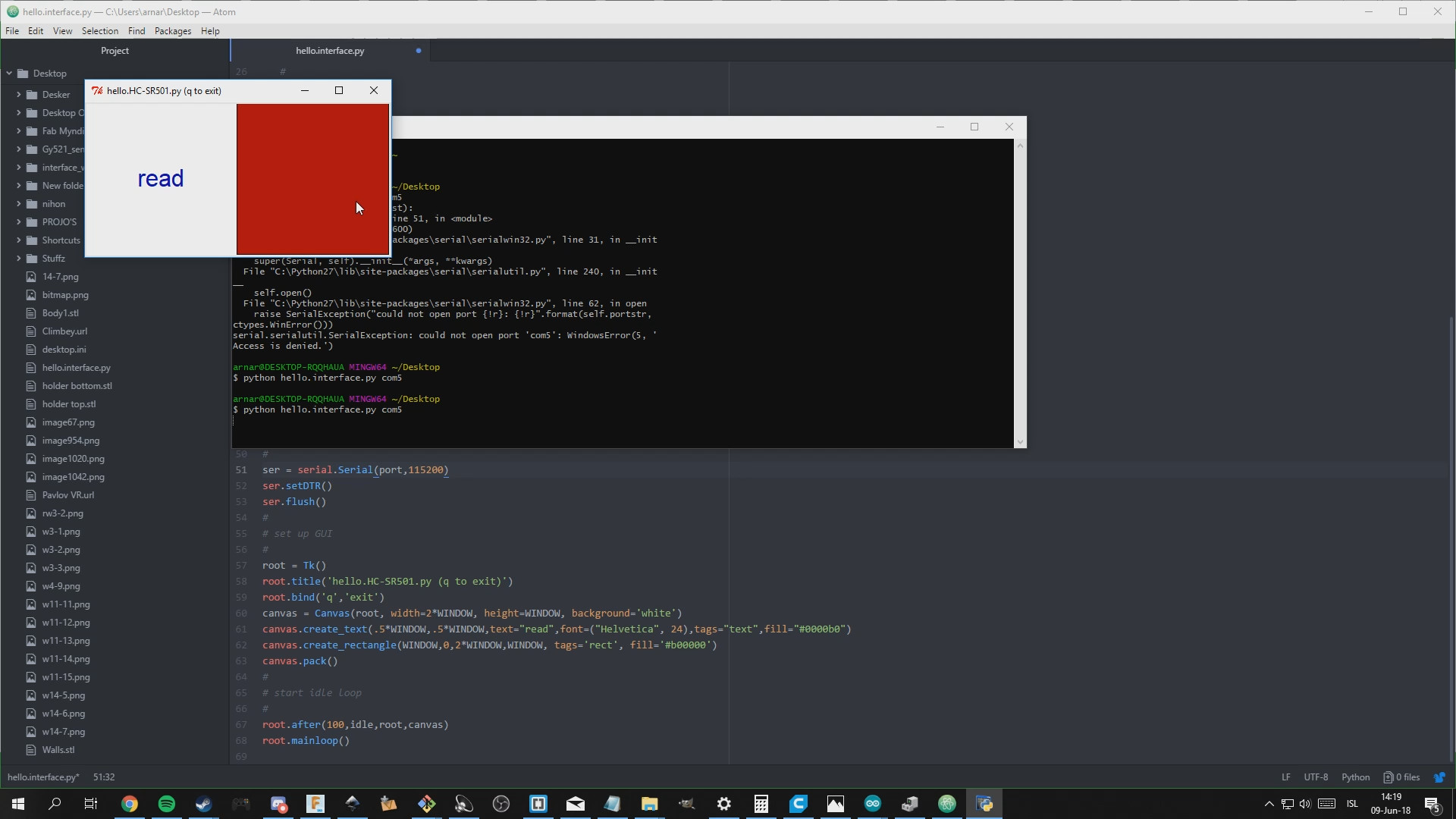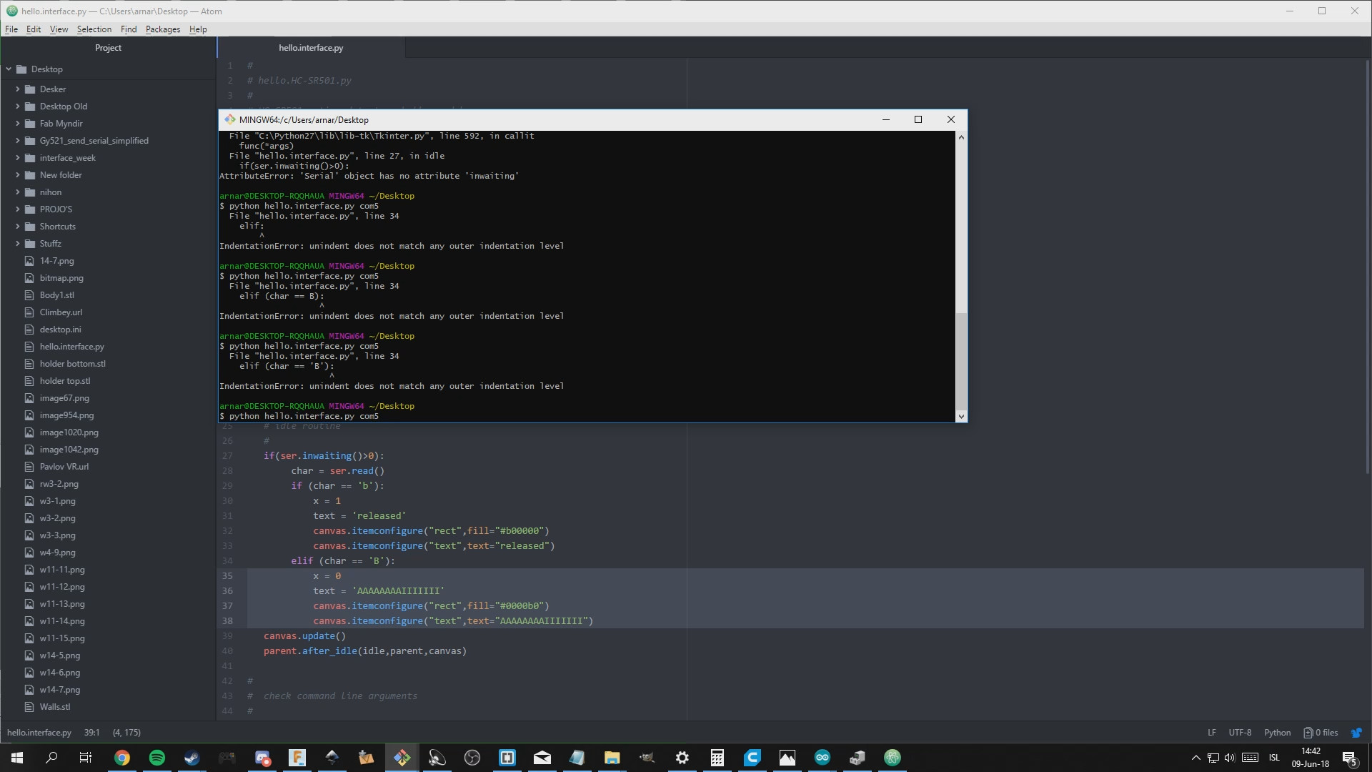 Then I got another error that said "'Serial' object has no attribute 'inwaiting'" so the w needed to be in capital so changing that and running the py works. Then I changed the "window" setting to change the size, the text and colour of the boxes and voila!