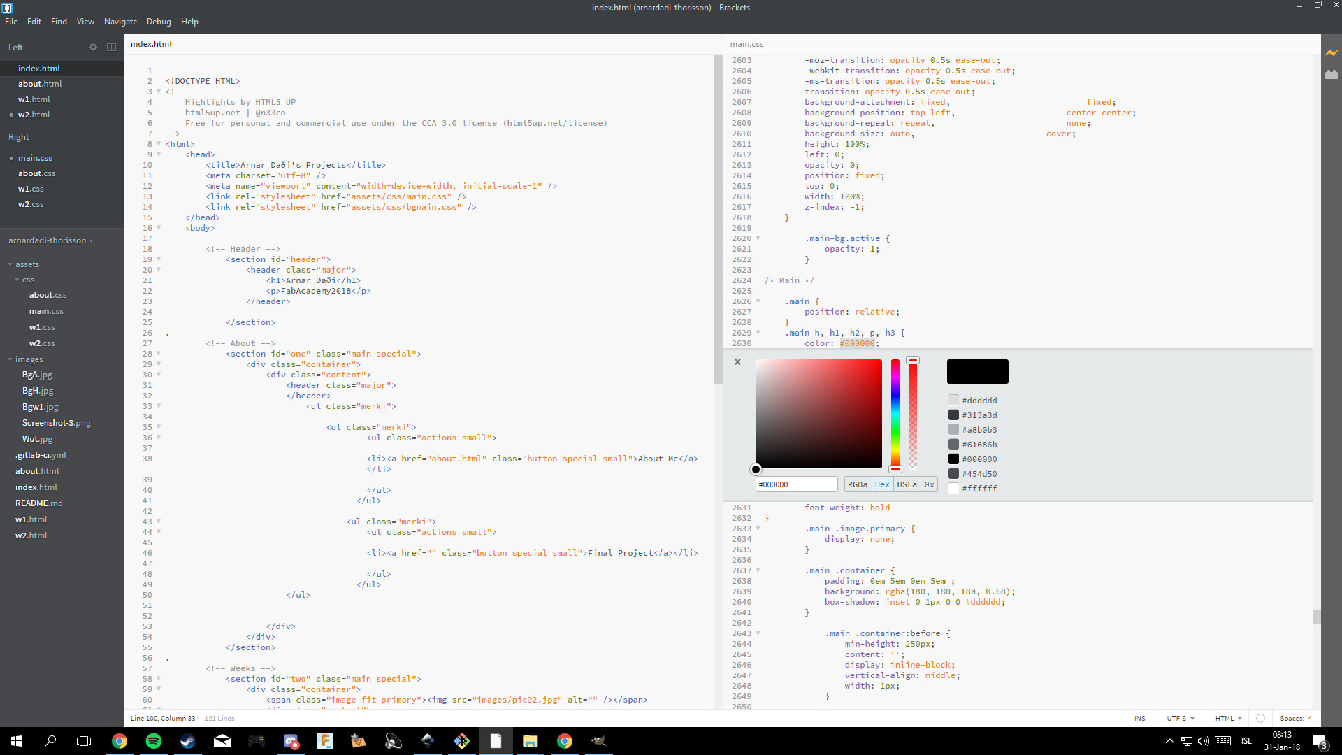 So by tinkering with the color codes I was able to learn better on CSS editing and was able to to see wich code belonged to what element and by learning that I got deeper into tinkering with coding and making the website more to my liking. The most valuable thing that I learned was wich CSS code belonged to a specific element and was able to create a code by myself so I could have more freedom over my page. One of the things I like about Brackets is that in live view is that you can also click on a specific area of the page and see where that element is and be able to troubleshoot from that area. The pictures that I use for this site are all .JPG but not .PNG since they take lesser space and converted them to 72 DPI by using