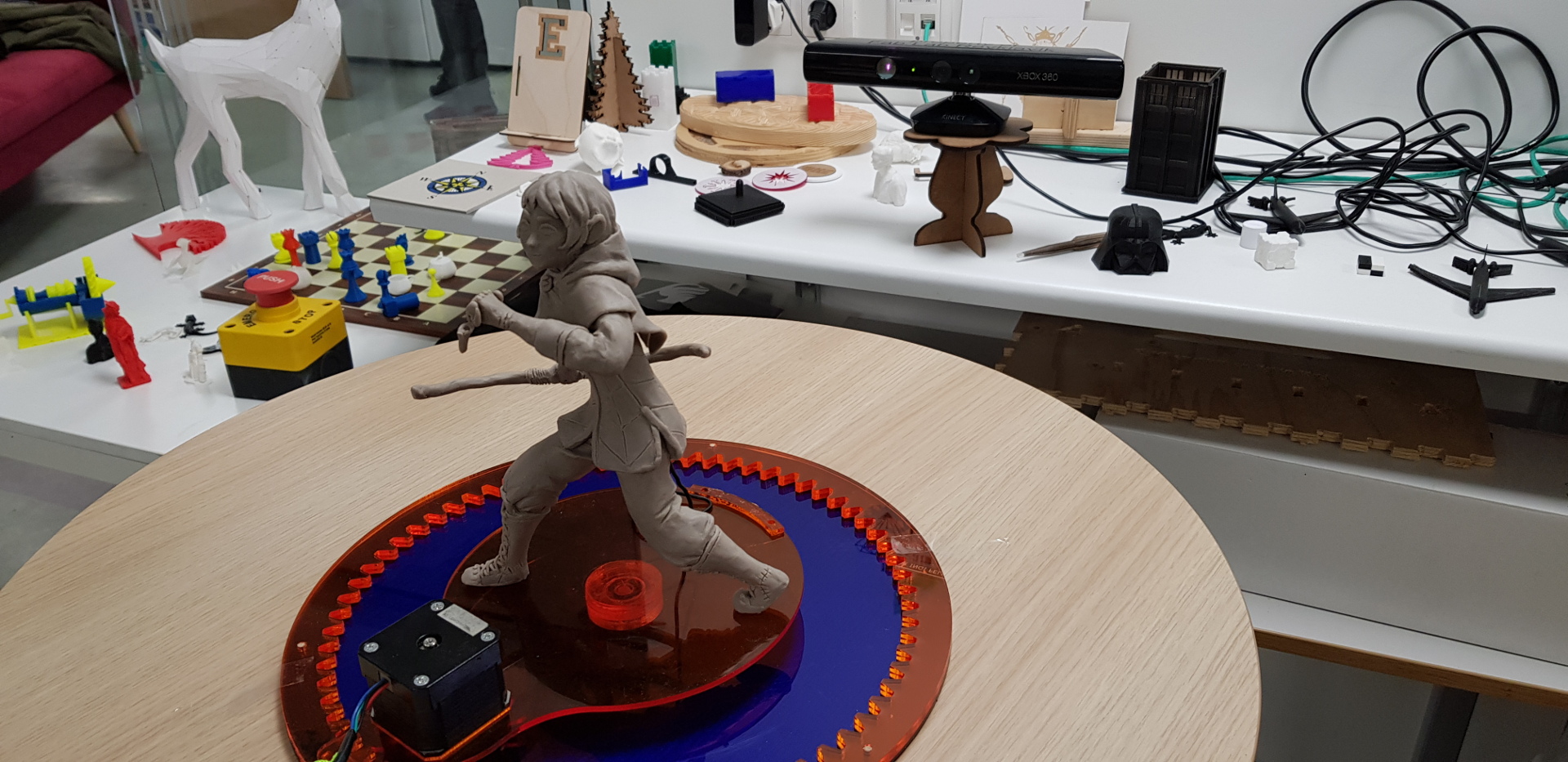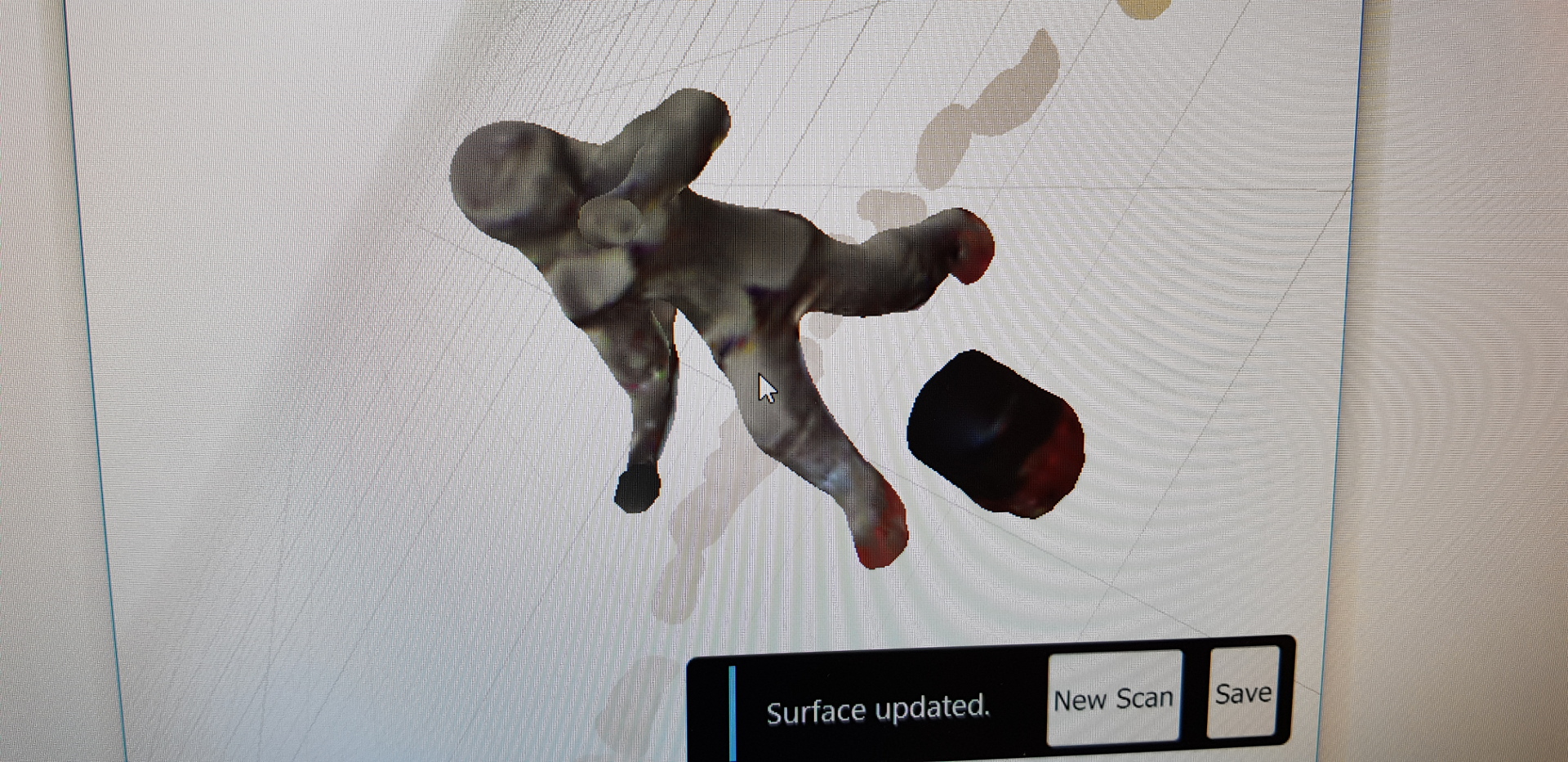 When trying we realised that the software is more suited for self scanning (aka person sized objects). We didn't have any other scanner so I grabbed a rotating board and scanned the clay model but it didn't come out nicely. Tha clay model is to small and has to many details.