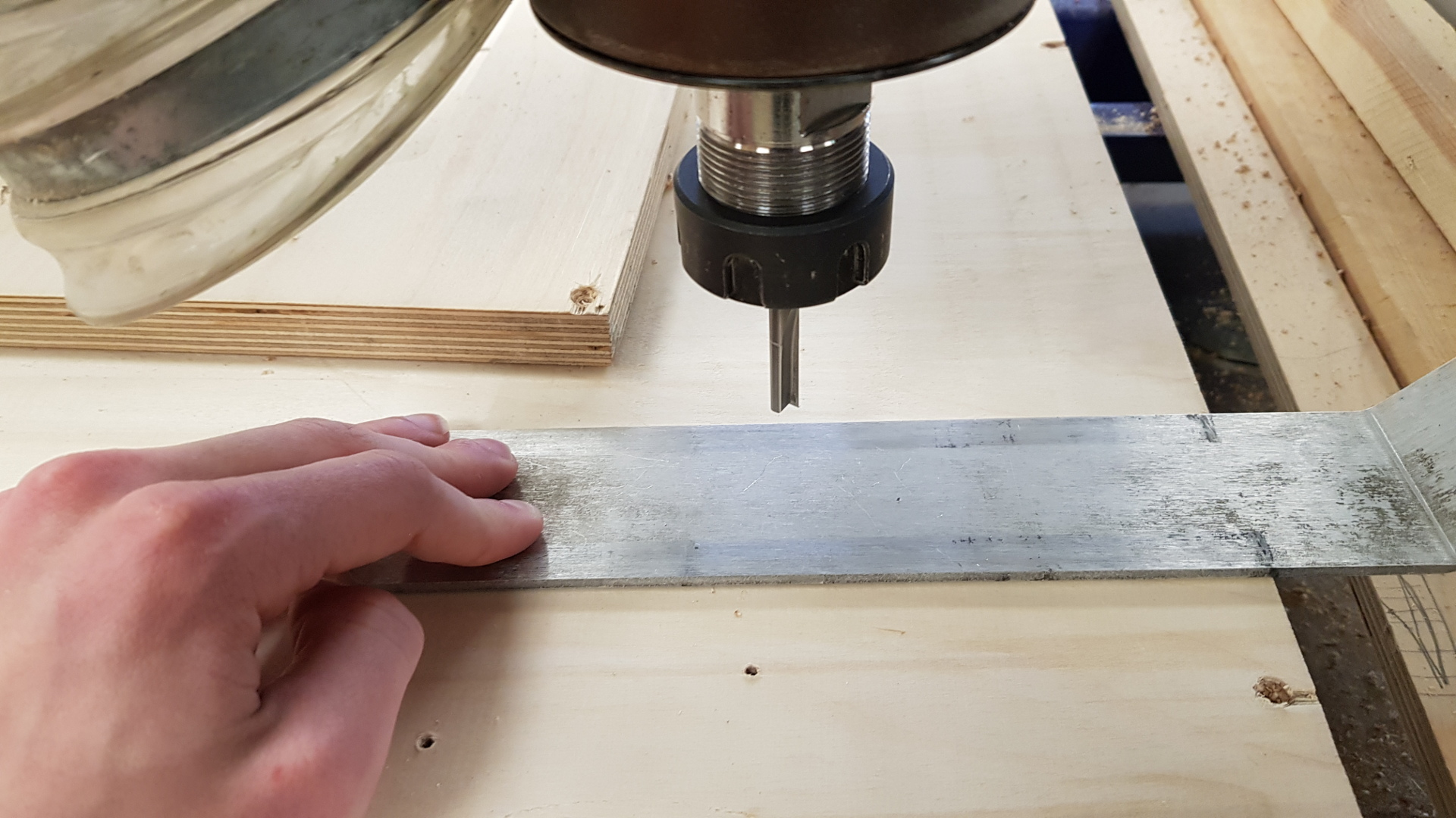 The first thing to do before running the shopbot is to fasten the material to the bed and zero every axis relative to the setup in the design files. I put the z-zero to the bottom of the material. The metal plate is to find where the z-zero is, so when the tool touches the plate, the software knows where z-zero is.