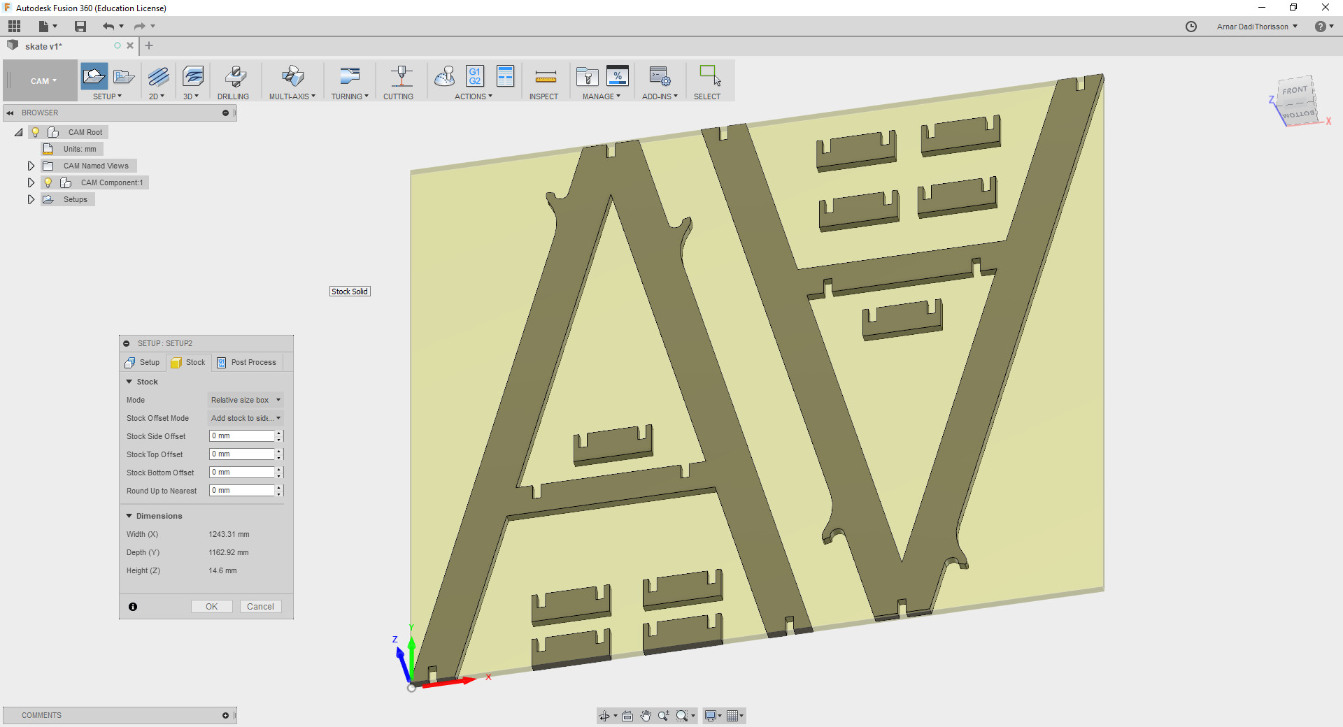 I started up with the setup for the material to cut. I measured scraps from the lab and found a plate thats big enough for my design. In fusion setup the stock to match the size of my design. I put the home point at the bottom of the material and at the bottom right corner.