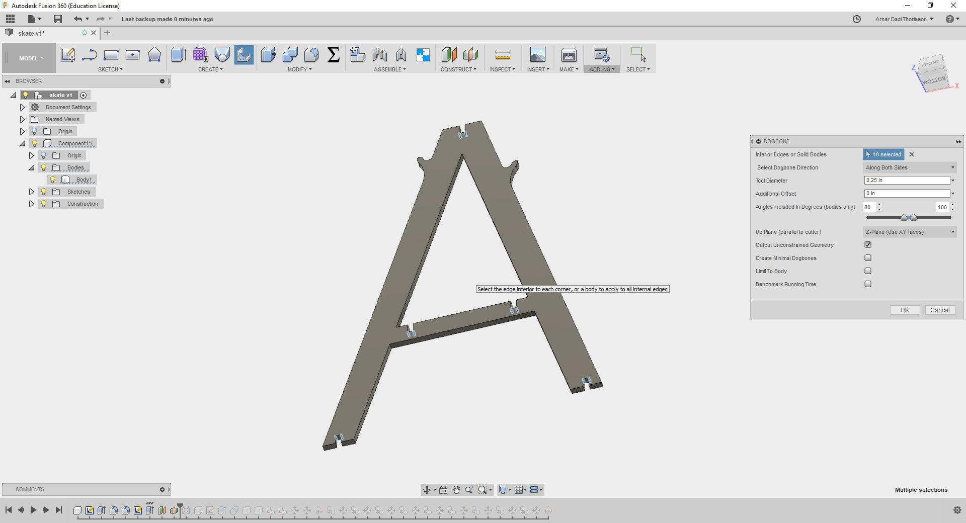 Do note that if you want to do use the dogbone extensipon, it's necessary to apply it as a last featur in the timeline, before going to cam. I found that if you want to change something earlier in the timeline it will mess up the design.x