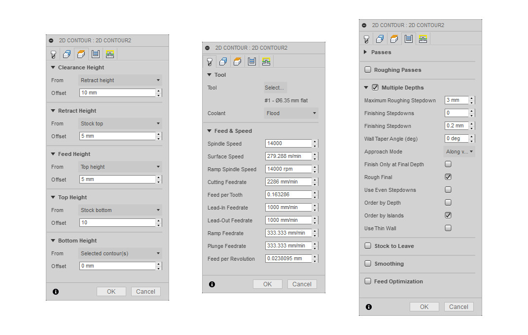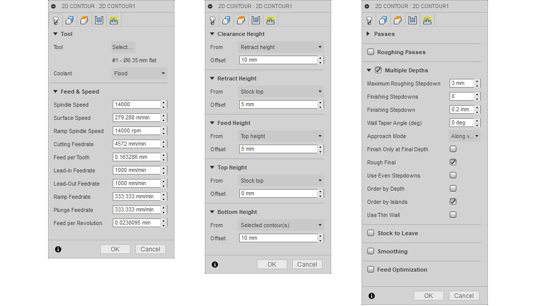These are the settings that I'm using for the first pass with a down-cutter. I used the feed and speeds setting from V-Carve and applied them in here. You can see in the height setting that I set the bottom height to 10mm because I wanted to leave 10mm for the up-cutter.
