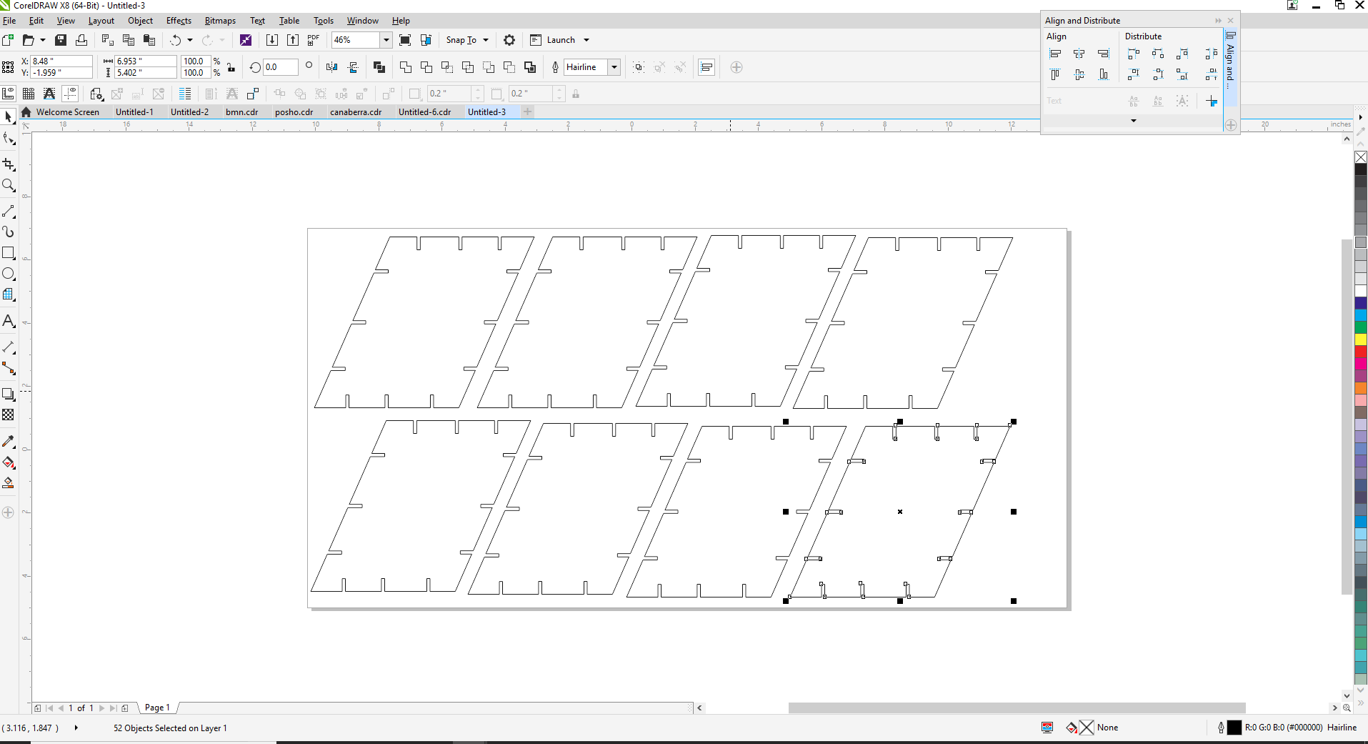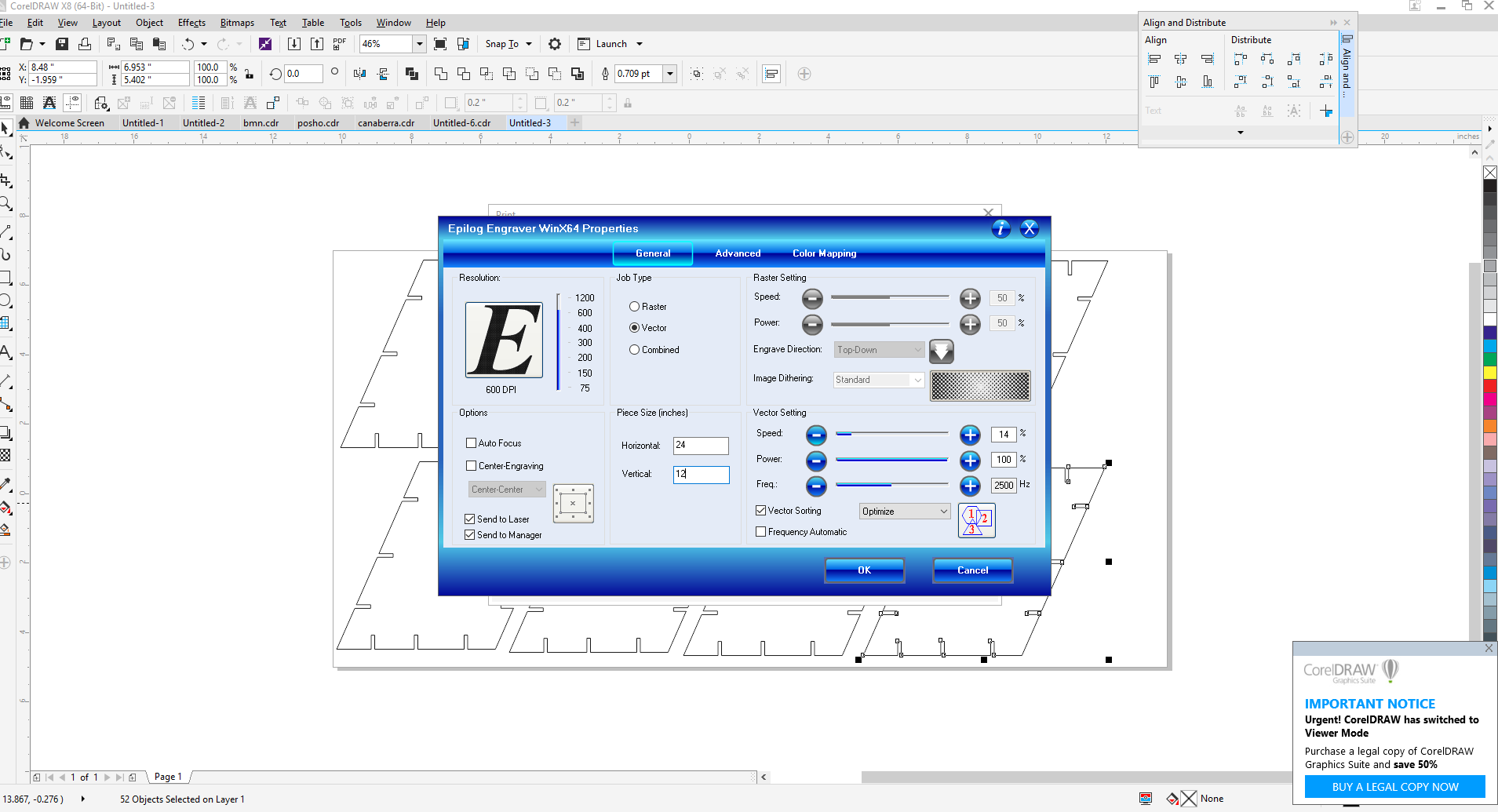 After importing the solidworks designs saved in .DXF in Coral draw.I wanted to print using Epilog Mini laser cutter. In particular with you have to be carefull since more power can burn it and also less power could result in not cutting,so you have to be careful with power and speed.