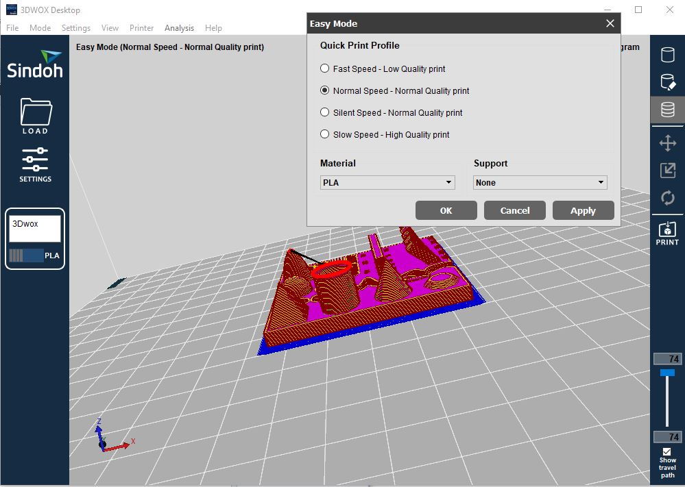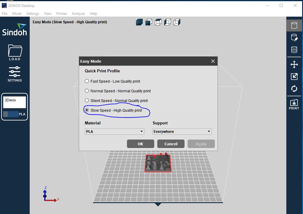 The following image is to change setting of our 3D printer to put on low speed and high quality also put support everywhere.