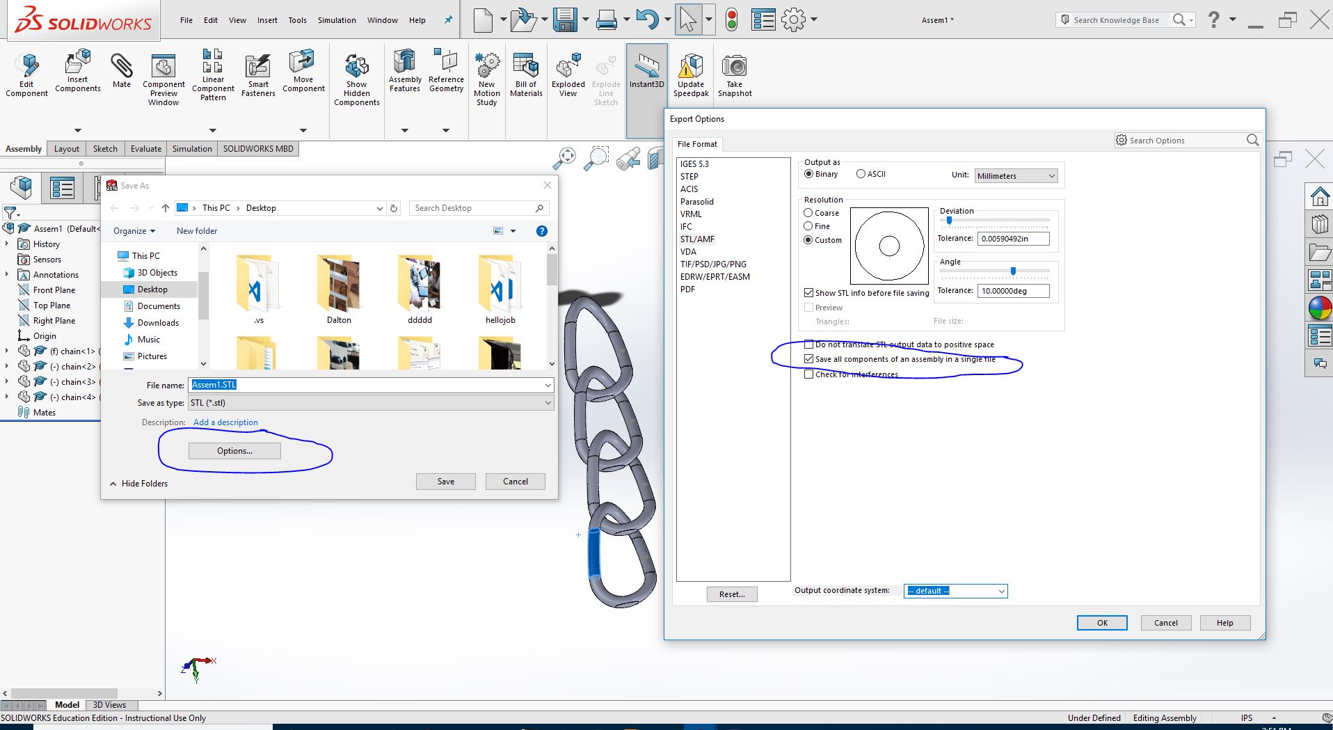 Again before print we need to save your file into STL file for example chain.STL this take me lot of time to known how to save assemble design into stl file. But we can see how i solve it on image below.