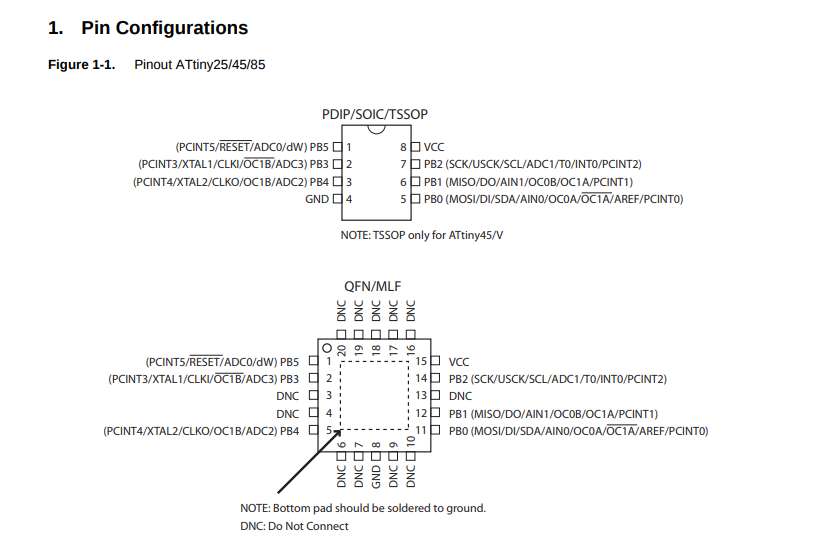 The ATtiny25/45/85 provides the following features: 2/4/8K bytes of In-System Programmable Flash, 128/256/512 bytes EEPROM, 128/256/256 bytes SRAM, 6 general purpose I/O lines, 32 general purpose working registers, one 8-bit Timer/Counter with compare modes, one 8-bit high speed Timer/Counter, Universal Serial Interface, Internal and External Interrupts, a 4-channel, 10-bit ADC, a programmable Watchdog Timer with internal Oscillator, and three software selectable power saving modes.