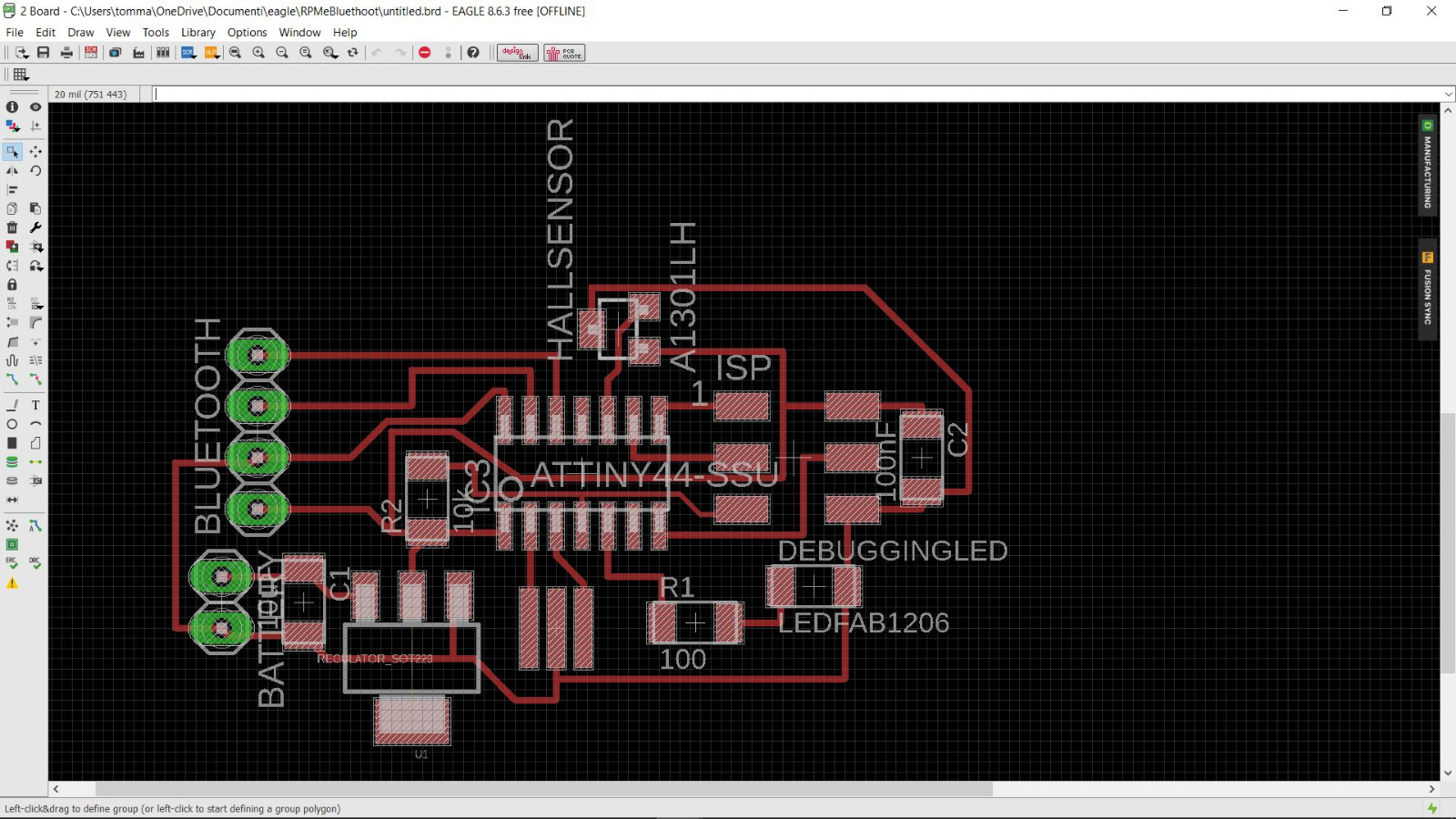 Using Eagles as always,the designing process wasn't hard.I provided my board whit a Voltage regulator to be powered whit a 9V battery, and with an HallSensor because I want this board to calculate RPM of the tubines in the near future.I also provide exposed pins for the Bluetooth module I'll use for Networking and communicationI found the package for the voltage regulator in the fab's library :
