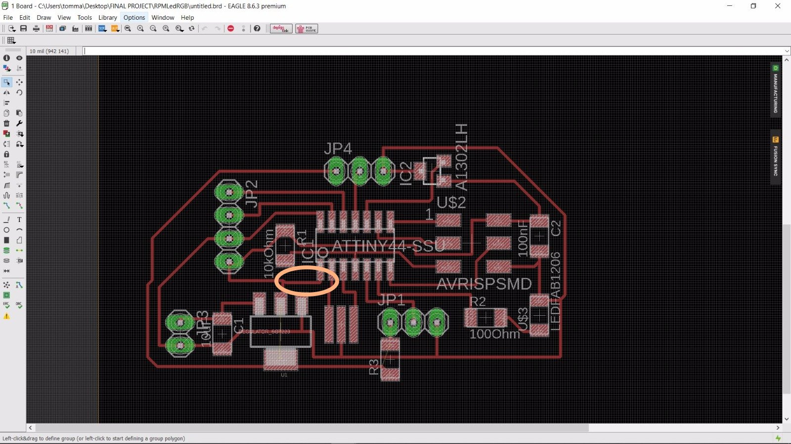 And I saw it only when I was soldering the ATtiny 44.At the moment I fixed it whit a small piece of a copper wire :