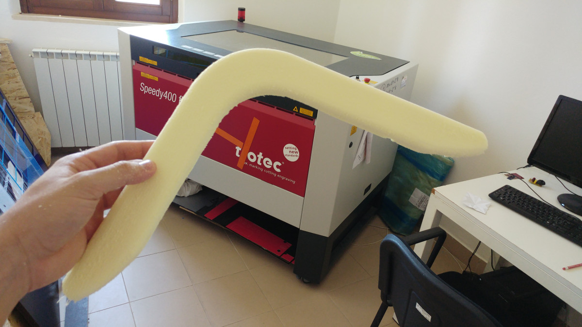 I wanted the polyestyrene to be sealed inside the jute fabric to give a frame to the boomerang so all the layers lister in the image above must be mirrored in the bottom,so I did :