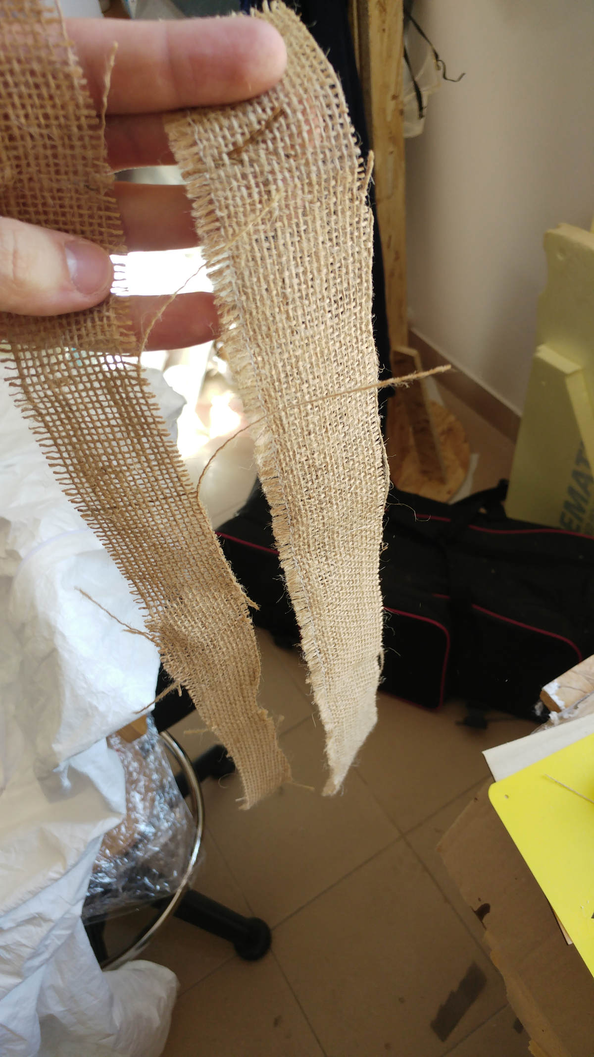 Next I drenched the thin stripes of jute in the glass whit the resin. I covered all the polystyrene mold whit those resinated jute strips,succeeding in applying 3 layers of epoxy-soaked jute stripes.
