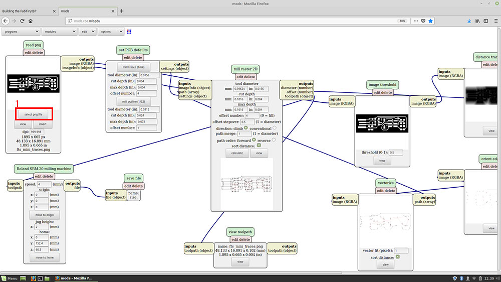 For this week assignment we had to make an in-circuit programmer by milling the PCB.We could chose from a list of ISP based on ATtiny45 or ATtiny44.Every single ISP of the list is well documented,I chose to make the FabTinyISP .First of all I downloaded the png files.One for the inner traces and one for the outline.Then I created the RML files whit mods.cba.mit.edu :
