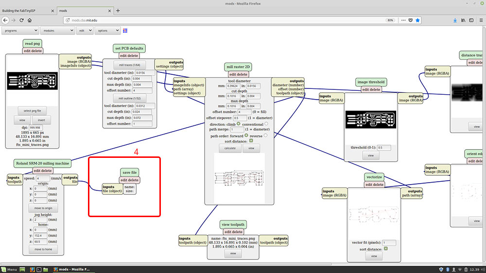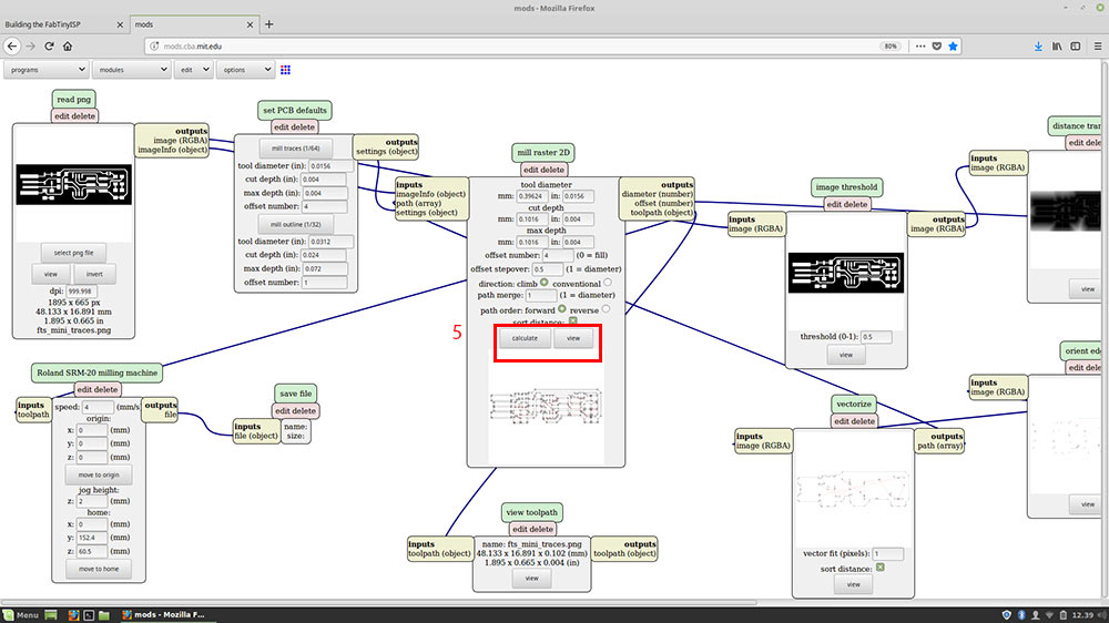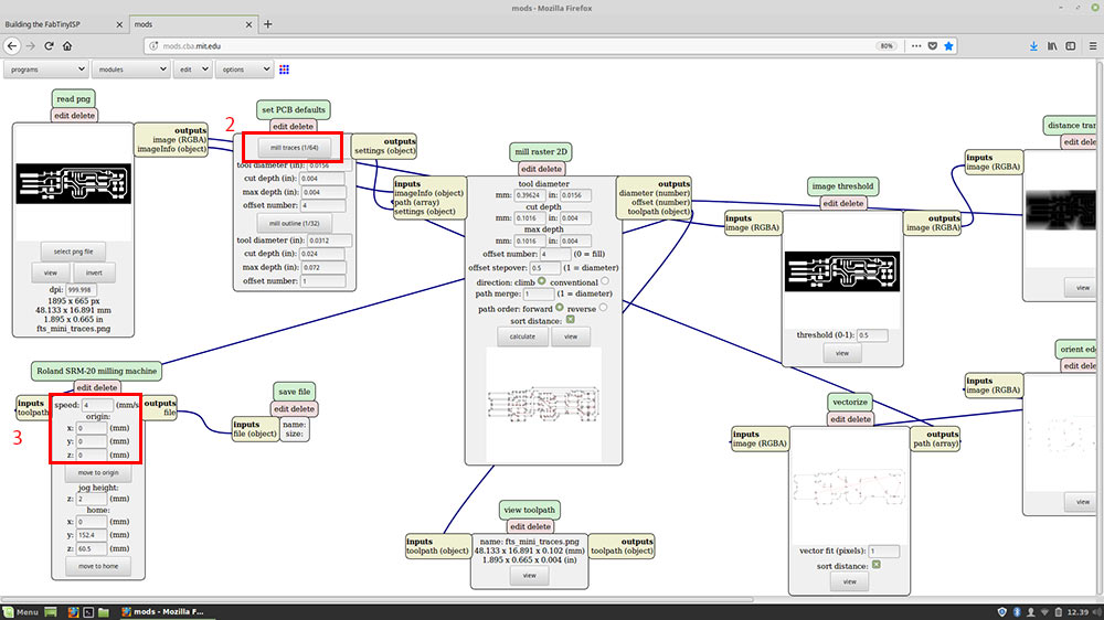 I followed the same steps to generate the file .rml for the outline, but instead of selecting mill traces(1/64) I selected mill traces(1/32)