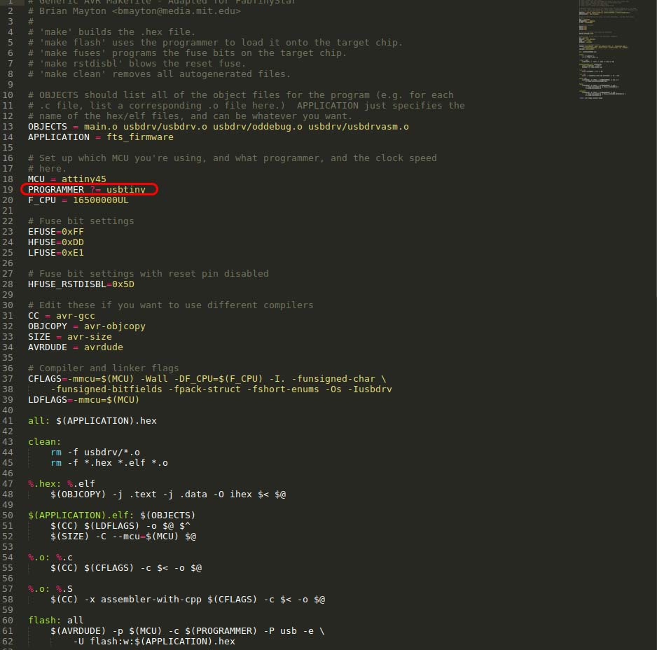 First, update the Makefile for the type of programmer you're going to use to program your board. The Makefile, by default, assumes that you're going to use a programmer in the usbtiny family (e.g. another FabISP board). If you're using a different programmer, first figure out what avrdude (the programming software) calls it