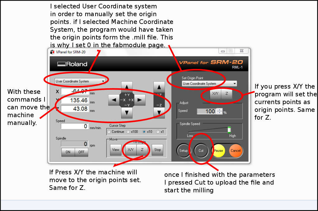 Once I've chosen the x,y coordinates to start the milling process, I pushed the Set X/Y button in the software to zero them. The same operation had to be done for the z, meaning that you have to lower manually (slowly and whit controlled steps) the milling tip over the board and after you've reached an height that is just enough, you have to manually un-screw the tip from the spindle, push it slightly over the PCB surface and screw it back.