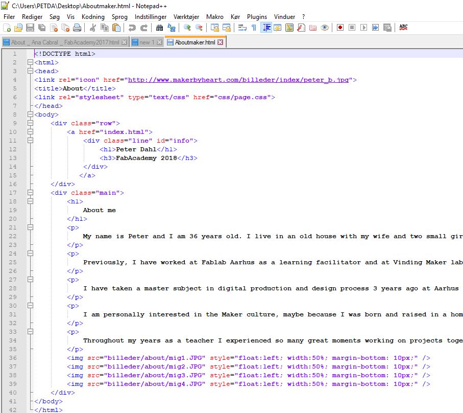 After a while I tried to put different structures of code up on my own webpage (which has been a blank page until I started the Fab Academy).