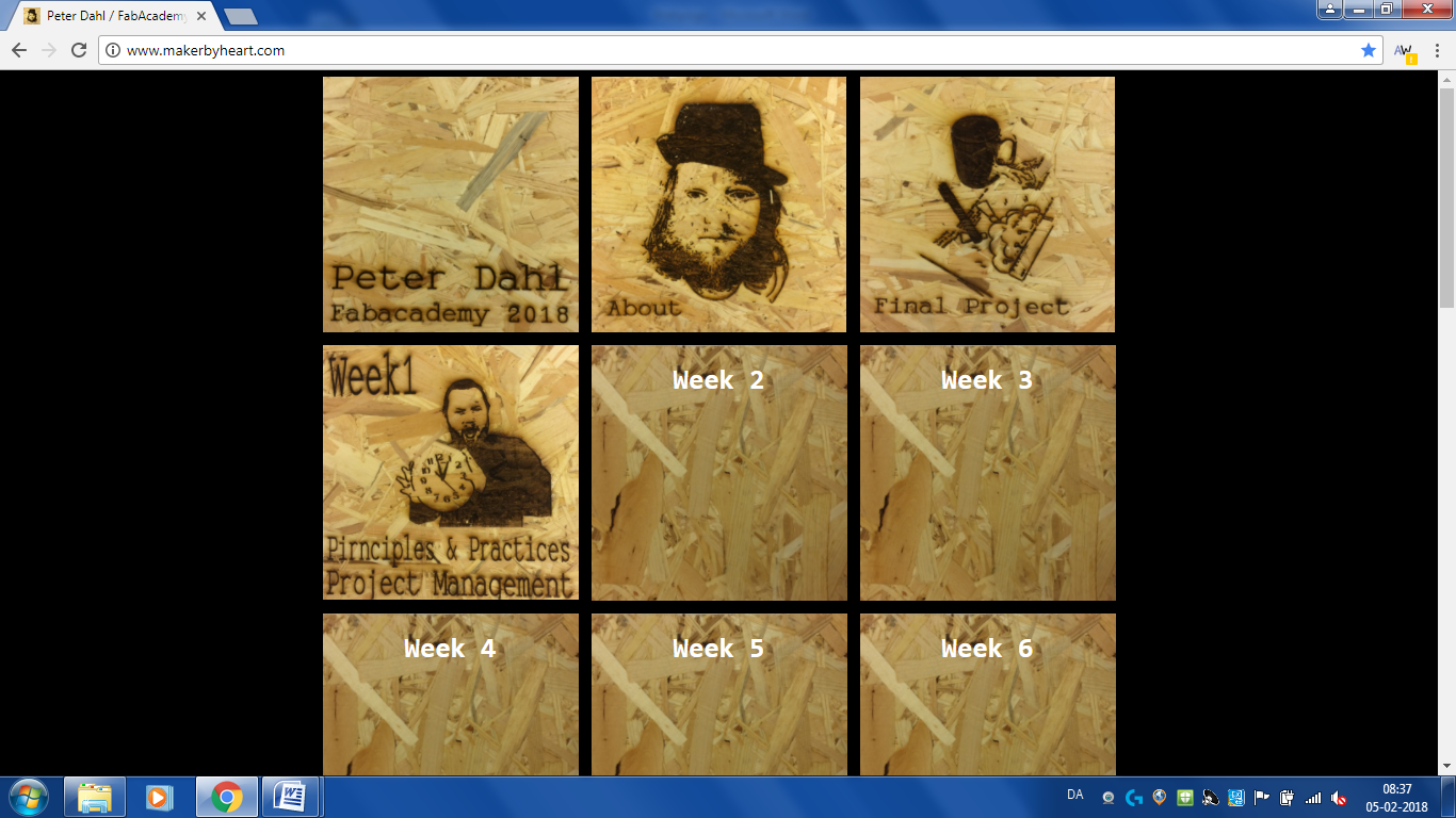I have constructed different structures for a simple webpage using Notepad ++, and while talking to a dear friend, we came up with the idea of making different icons for each button on the page and engraving the icon with the laser on OBS-fiberboard for a more rough expression. I have drawn the icons by hand and vetorised the drawings in Inkscape, Affinty designer and mixed them up with pictures taken with Adope capture. Finally they were engraved, using the laser. The idea behind the icons/buttons is that they must be made along the way as the weeks go and they each have a picture symbolizing the week. Like a photo or design from the week that has just begone. Therefore, the icons will come during the weeks Fab Academy runs.