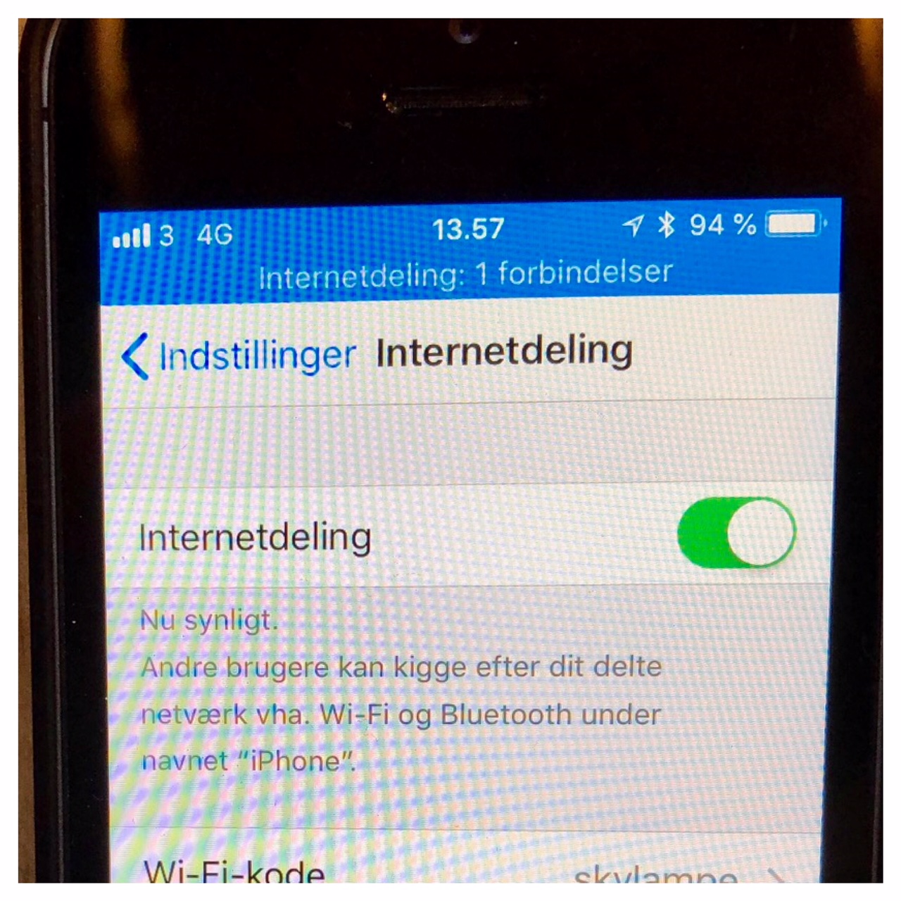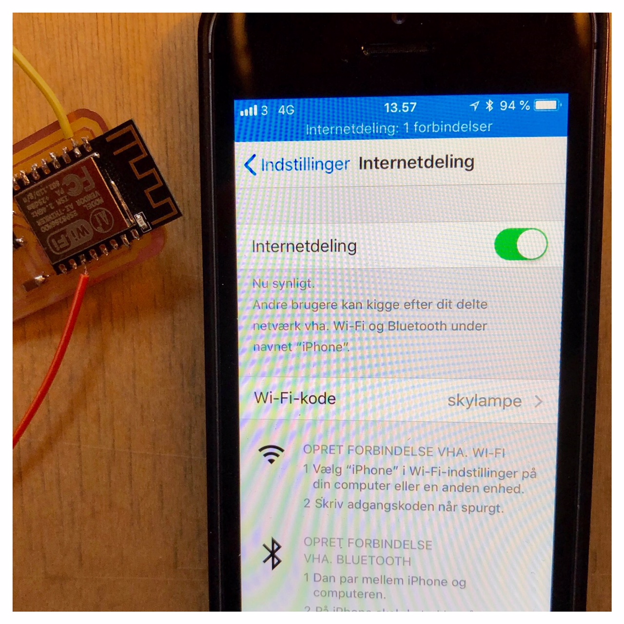 As you can see on the picture below the ESP is connecting to my iPhones shared internet. In the code I managed to flash to the ESP12e it says that it should connect to the Internet called "iPhone" with the password "skylampe". In the upperpart of the picture of the iPhone is says in danish: "Internet sharring 1 connection". So it definitely connects to my phone.