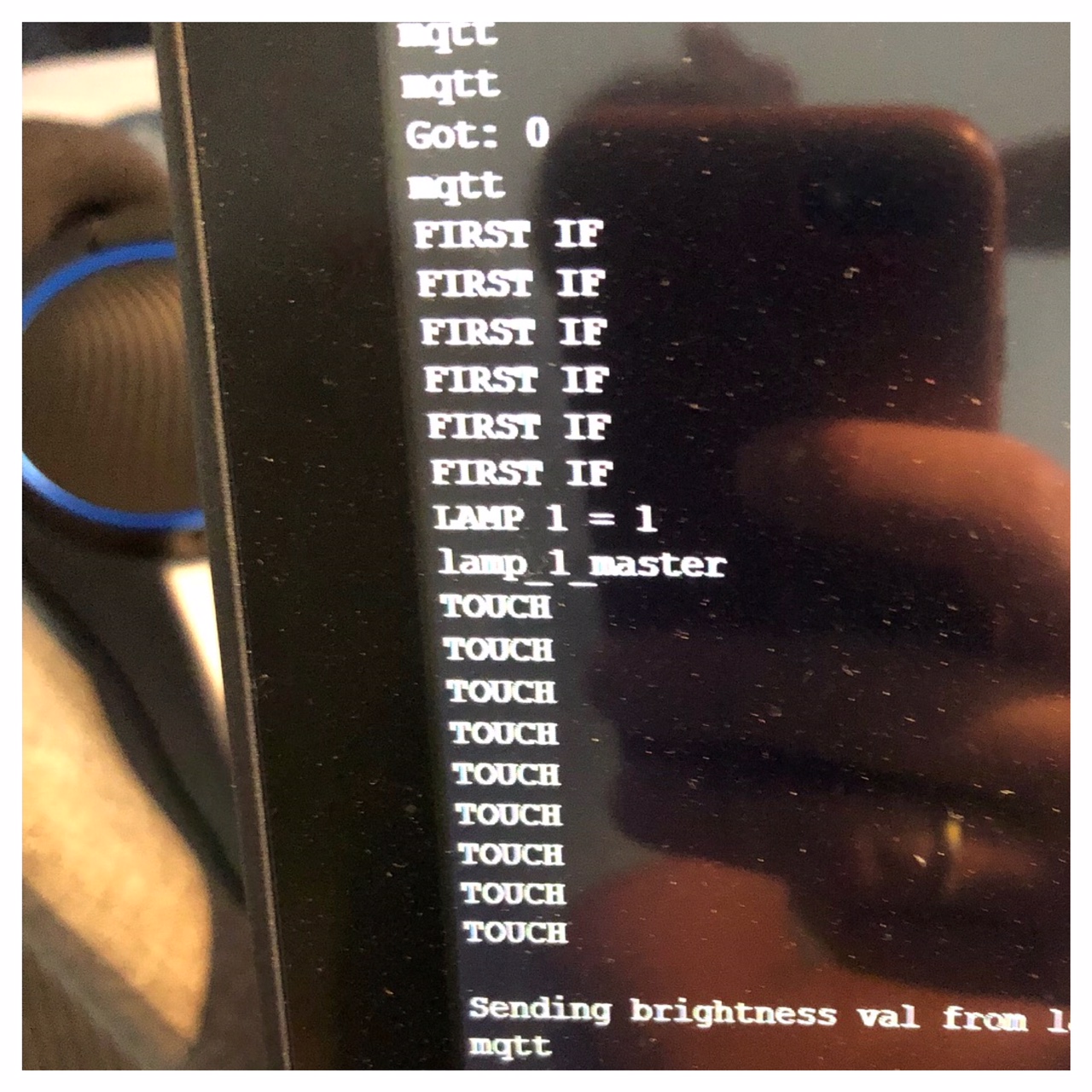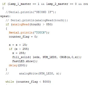 Then I downloaded this software called PuTTY, where I could monitor signals coming into my computer and which port it's using and follow the protocols of the network. I could see when I touched pin 2 (the ADC, TOUT) on my esp I got a "TOUCH" signal comming into my computer and "FIRST IF, LAMP 1=1, LAMP_1_master, TOUCH, TOUCH..." So it was actually performing my code.