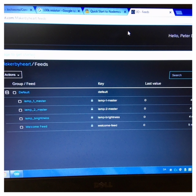 I added the board node MCU 1,0 (ESP-12e module) to my ArduinoIDE together with the Adafruit Libery (lib) and ran a code sample for Arduiono. I changed the server info and added the AIO key that I got from Adafruit in the script and it worked. As you can see on the pictures below I am now sampeling the lamp-1-master. There is one more lamp added the server lamp-2-master (that is going to be built by the kids in Mutku Maker Space in Finland). As for now the lamp is responding to the server as you can see by the number 1 and as you connect with the lamp the brightness will turn up and hopefully with time connect to the other lamp.